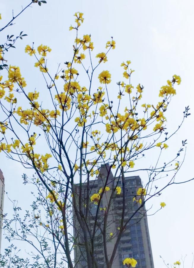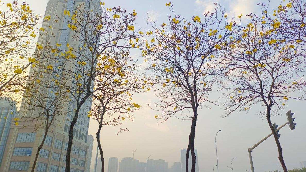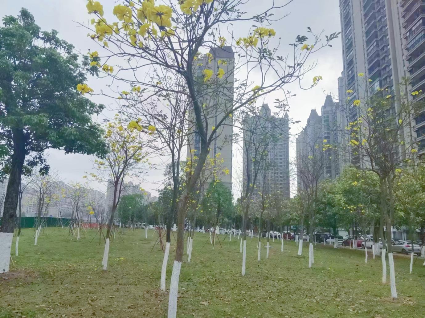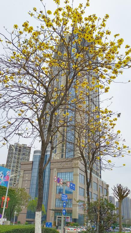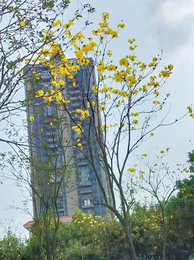 二桥东御景半岛前绿地黄花风铃木正陆续绽放