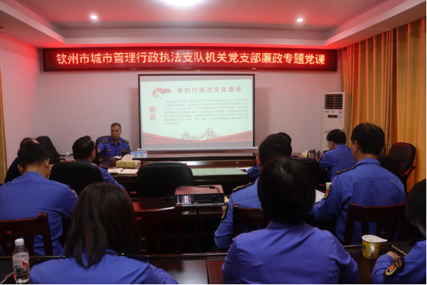 市城管执法支队领导班子成员首先传达学习党的二十大关于全面从严治党的新部署新要求,结合城管执法工作实际剖析了支队党风廉政建设的情况,围绕“正确认识党风廉政建设和反腐败工作的新形势新要求,将全面从严治党与落实党的二十大精神紧密联系在一起”、“牢固树立纪律意识和规矩意识,防微杜渐自觉筑牢拒腐防变思想防线”、“查找和确定廉政风险点,着力抓好廉政风险管理防范”等内容展开授课。