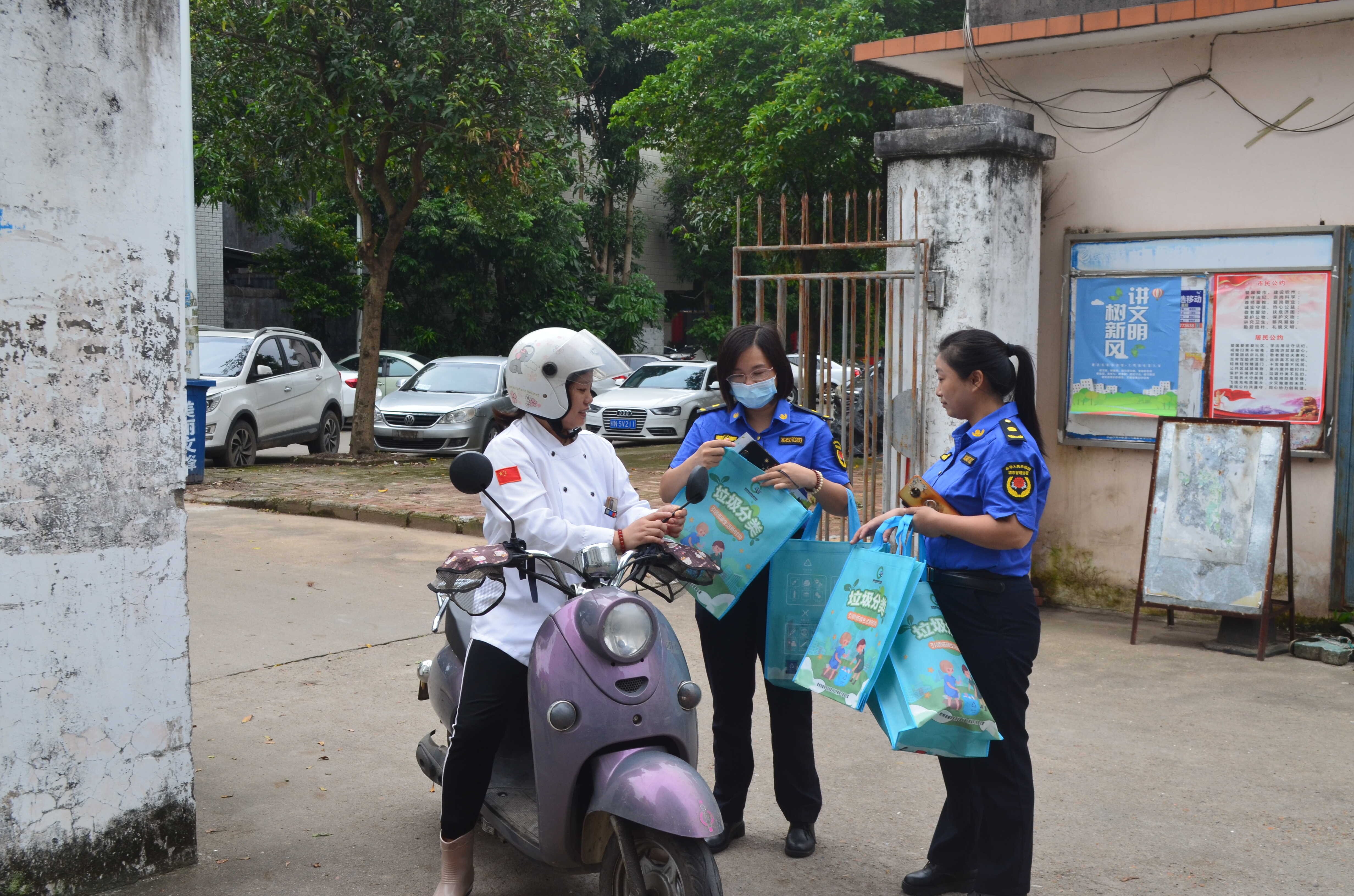 执法队员向群众发放垃圾分类宣传资料并讲解垃圾分类相关知识