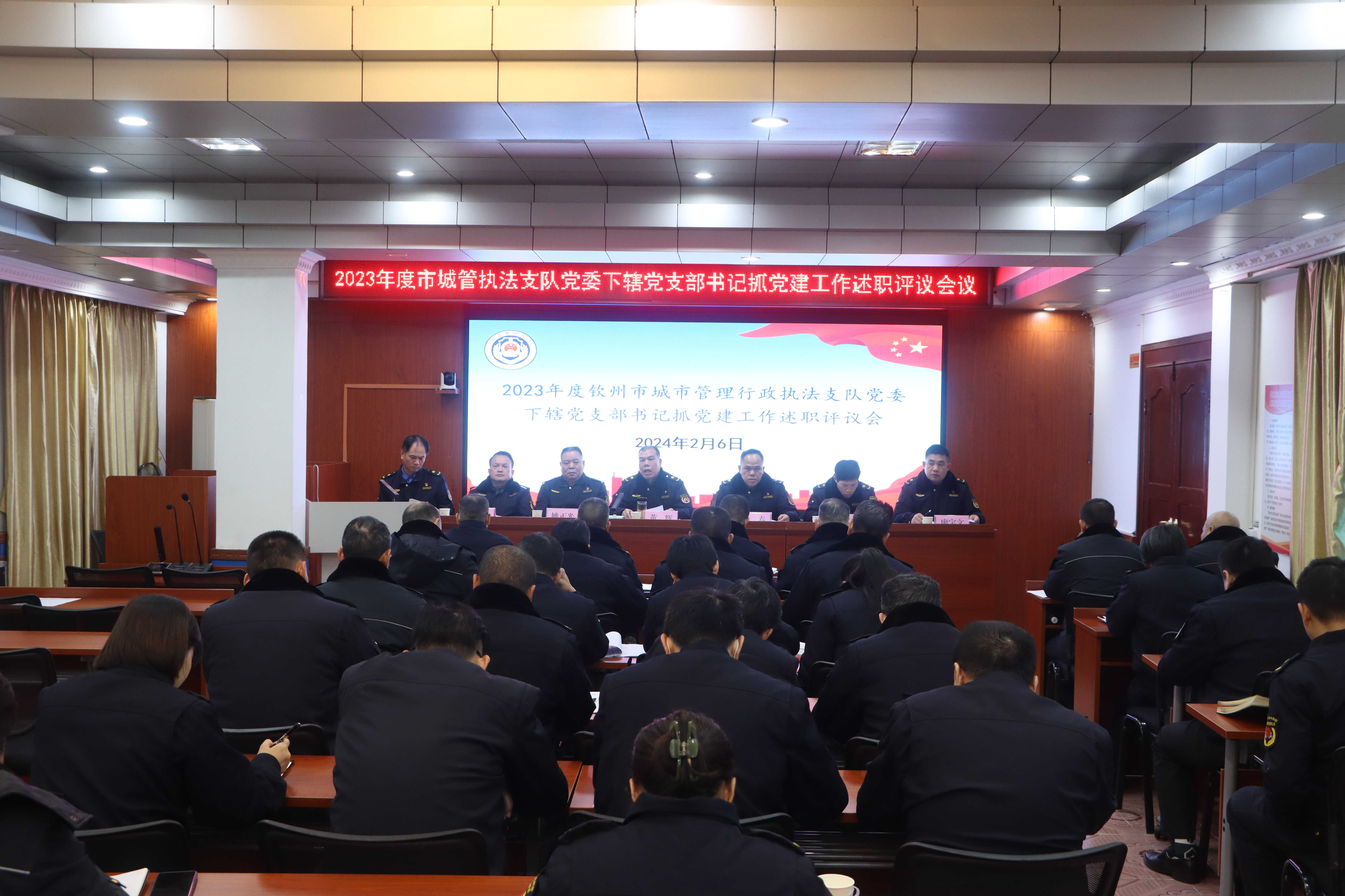 2024年2月6日下午,市城管执法支队党委召开2023年度党支部书记抓党建工作述职评议会。会议由市城管执法支队政委、党委书记主持,市城管执法支队党委班子成员、各党支部班子成员和党员代表共45人参加会议。
