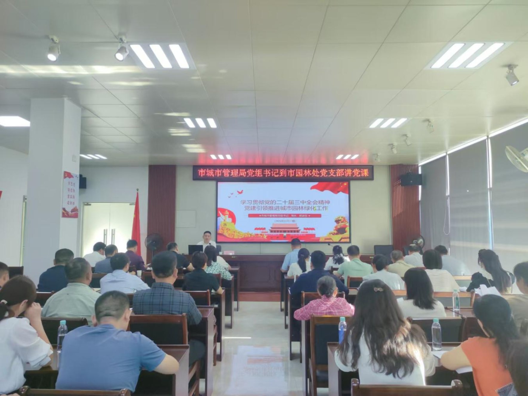 随后,局党组书记来到市园林处为市园林处党员干部讲授党课。他强调,要把思想和行动统一到党的二十届三中全会精神上来,统一到自治区、市委、市人民政府和局党组的决策部署上来,紧紧围绕创建国家生态园林城市目标,认真贯彻落实新发展理念,将学习贯彻习近平总书记重要讲话精神和全会精神作为当前和今后一个时期的重大政治任务,把全会部署的改革任务与园林绿化工作结合起来,坚持“人民城市人民建,人民城市为人民”的理念,采取“物业式”的城市管理模式,以党建引领持续提高城市园林绿化科学化、精细化管护水平,以园林绿化工作高质量发展助力加快建设高质量发展、高水平开放、高品质生活的滨海运河城市。