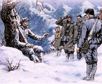 一个冻僵的老战士,倚靠一棵光秃秃的树干坐着,一动也不动,好似一尊塑像。他浑身都落满了雪,可以看出镇定、自然的神情,却一时无法辨认面目。半截带纸卷的旱烟还夹在右手的中指和食指间,烟火已被风雪打熄。他微微向前伸出手来,好像要向战友借火。单薄破旧的衣服紧紧地贴在他的身上。