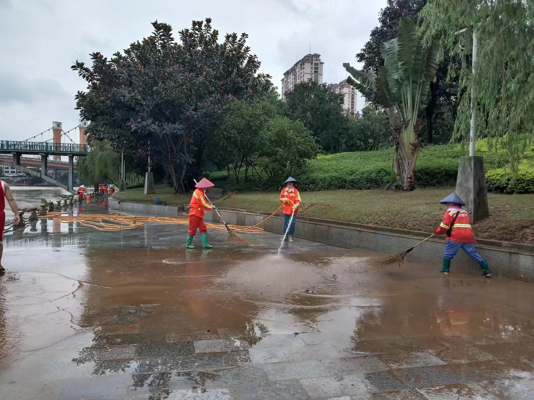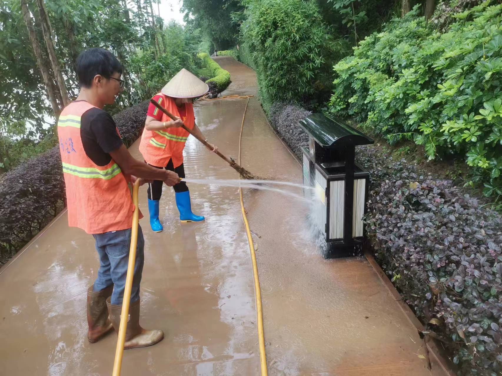 图为园林工人清洗沿江步道淤泥