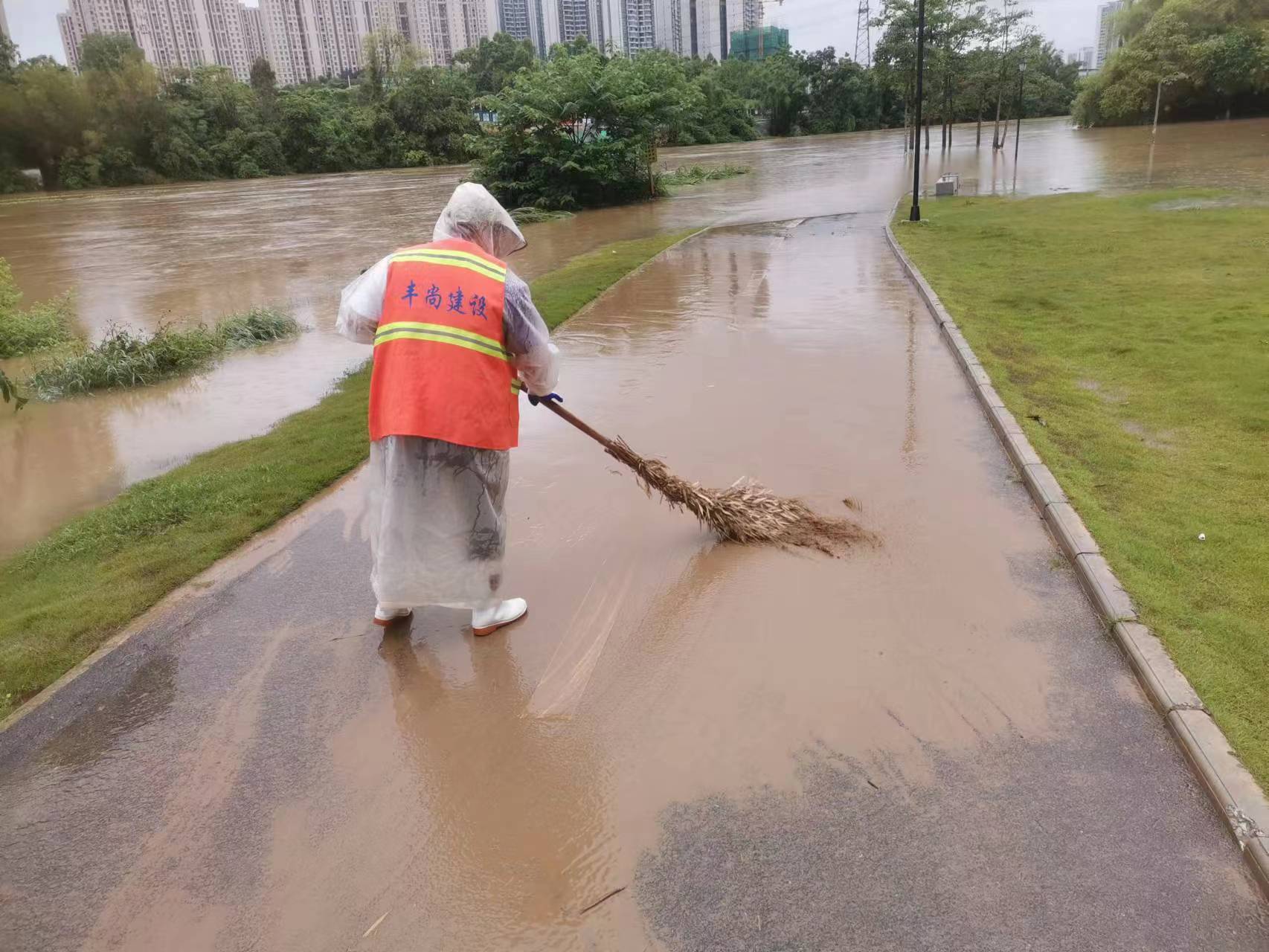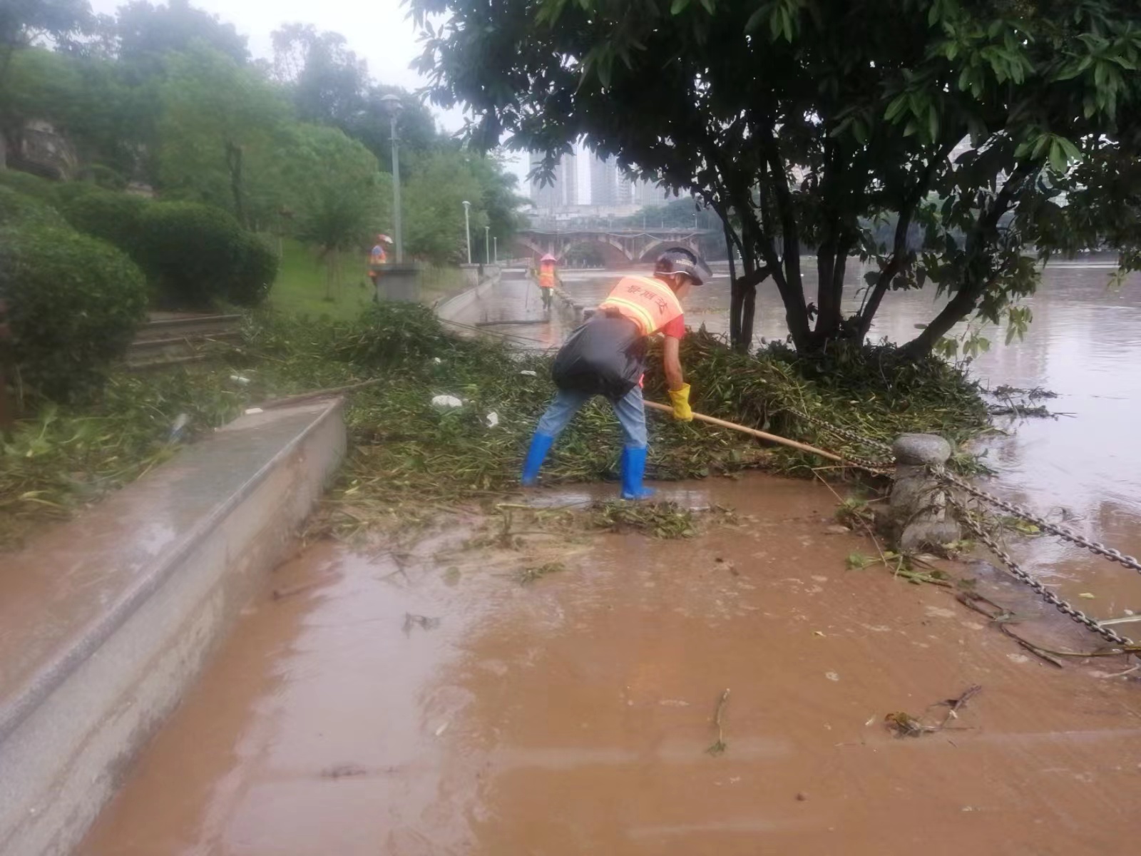 图为园林工人清扫沿江步道淤泥