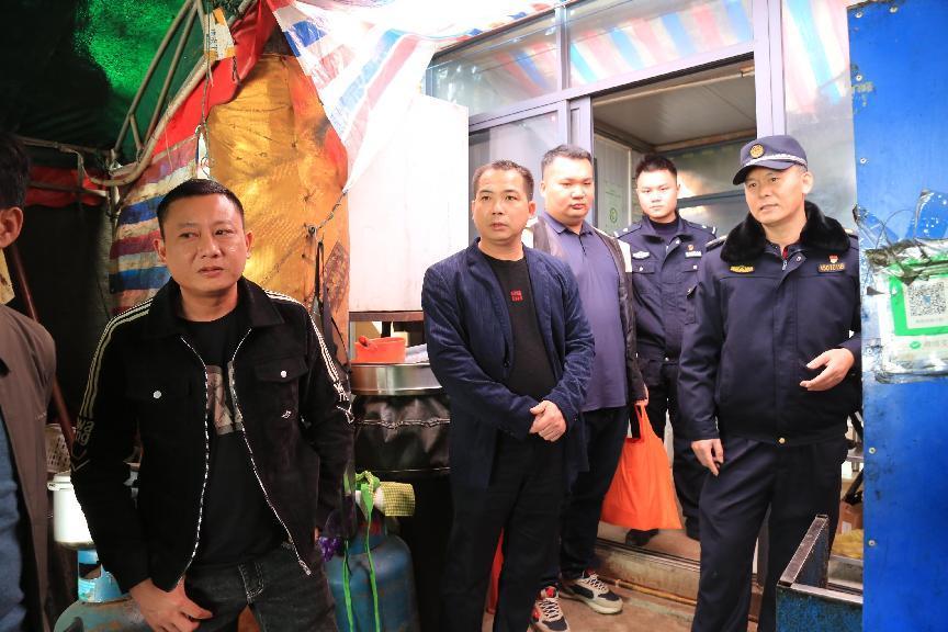 图为城管队员联合其他部门工作人员开展消防检查工作