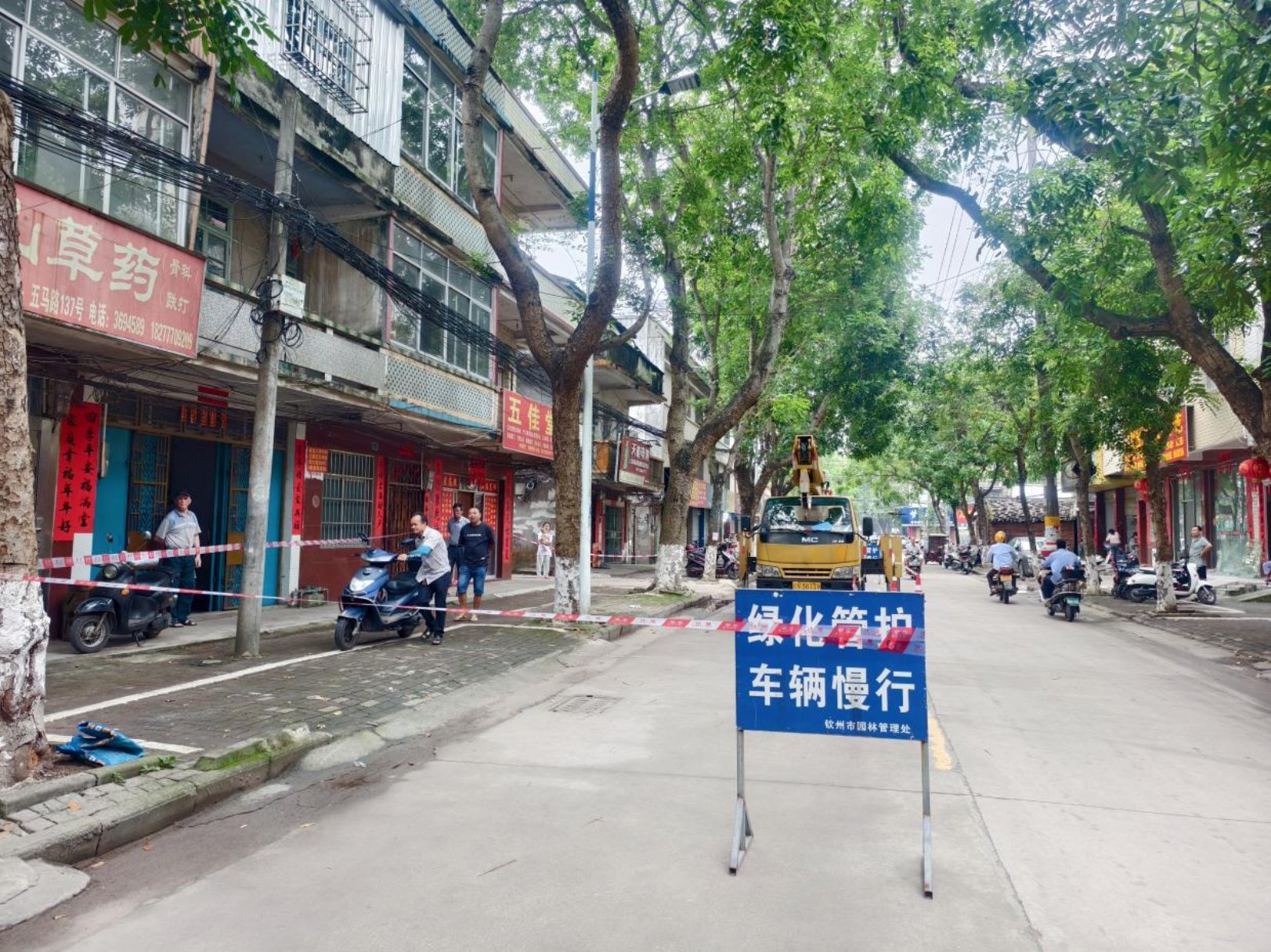 时至仲夏,雨水偏多。市区行道树过高过密,不仅会遮挡交通标志牌和影响路灯照明,枯损的树枝还会对过往车辆行人造成安全隐患。为营造靓丽、安全的城市绿化环境,预防强降水引发的树木倒伏,市园林处对市区的高大乔木开展修剪减负处理工作,提高树木抗风能力,消除路面安全隐患。