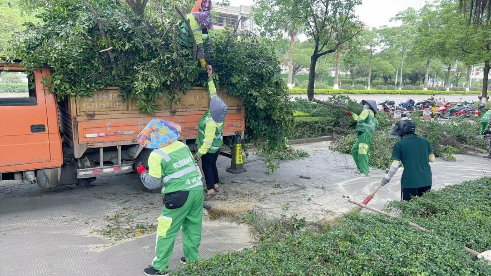 2024年5月15、16日,园林工人在扬帆大道和五马路利用高空作业车对道路旁冠幅较大的行道树小叶榕和树龄在10年以上的高大桃花心木进行“减重”修剪,将倾斜树干、遮挡性枝叶、靠近居民房子的枝条和高空枯枝进行切断和修剪,降低刮风暴雨带来的安全隐患,并第一时间清理现场枝叶,确保周边安全、整洁。