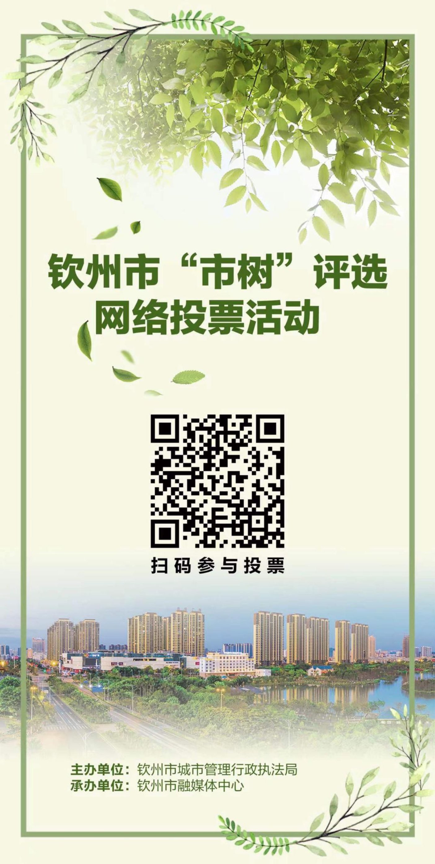 目前,在中山公园、梦园、同心园、江滨公园东岸、白石湖公园、钦州湾广场都张贴有宣传海报,可以通过手机扫描海报上面的二维码进行投票,投票截止时间为2024年6月20日,市民朋友可积极参与到市树投票中,为自己喜爱的树种投上宝贵的一票。