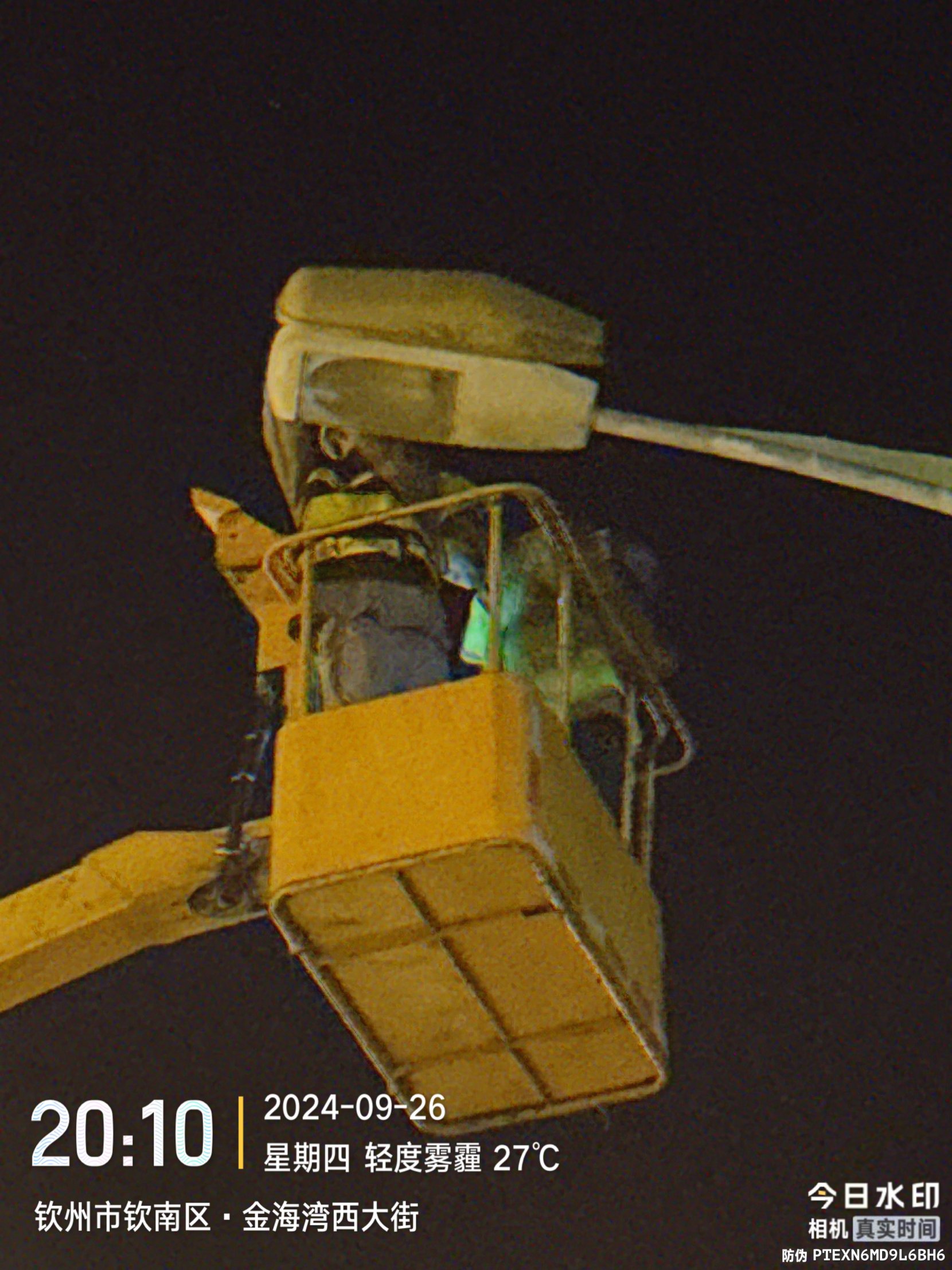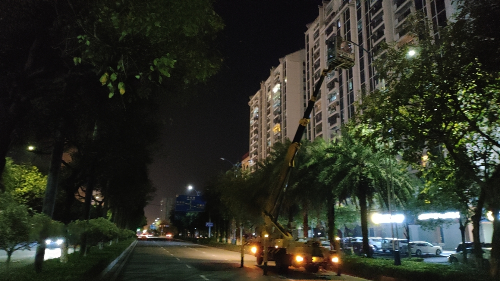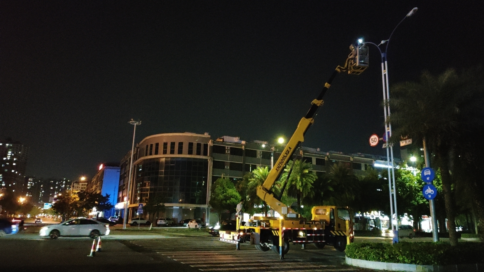 图为一线路灯养护工作班组正在维修路灯