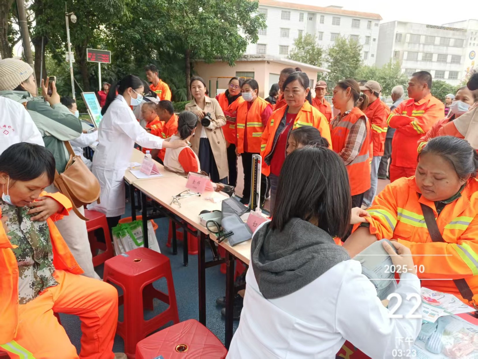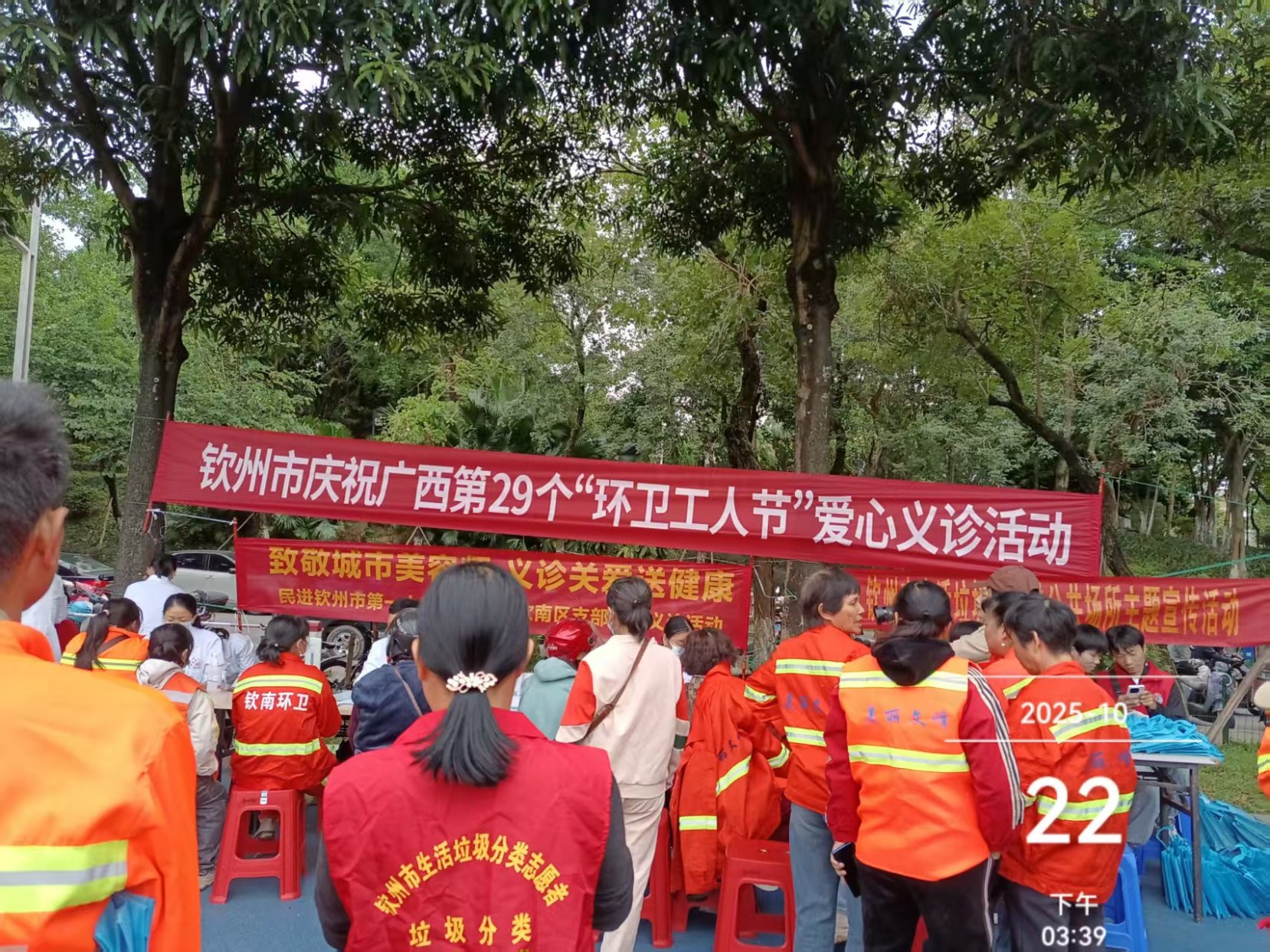 10月22日下午,市城市管理局联合民进钦南区支部、市第一人民医院及钦南区人民医院,在中山公园体育场为一线环卫工人送上爱心健康义诊服务。针对环卫工人肩颈腰腿劳损多发、户外作业易受天气影响等职业特点,现场专门设置肩颈腰腿疼痛科、预防保健科、全科等诊疗台,为环卫工人们提供免费的基础健康筛查、专科咨询诊疗服务。医护人员还通过健康宣传展板,详细讲解秋冬季常见疾病预防、户外作业防晒防寒技巧、职业病防护及合理膳食等知识,让环卫工人们在家门口就能享受到专业的医疗服务。同时,现场设置的垃圾分类宣传专区热闹起来,工作人员结合环卫工作实际,向环卫工人细致讲解生活垃圾分类标准、不同场景分类技巧及相关政策要求,并赠送定制的分类垃圾桶、宣传手册等物料,助力他们在一线作业中更好地引导市民参与垃圾分类。拿到宣传物料的环卫工人代表笑容满面,纷纷表示既感受到了温暖,又学到了实用知识,今后会以更饱满的热情投入工作,既做好保洁工作,又当好垃圾分类宣传员。