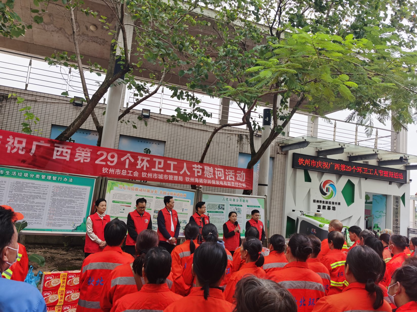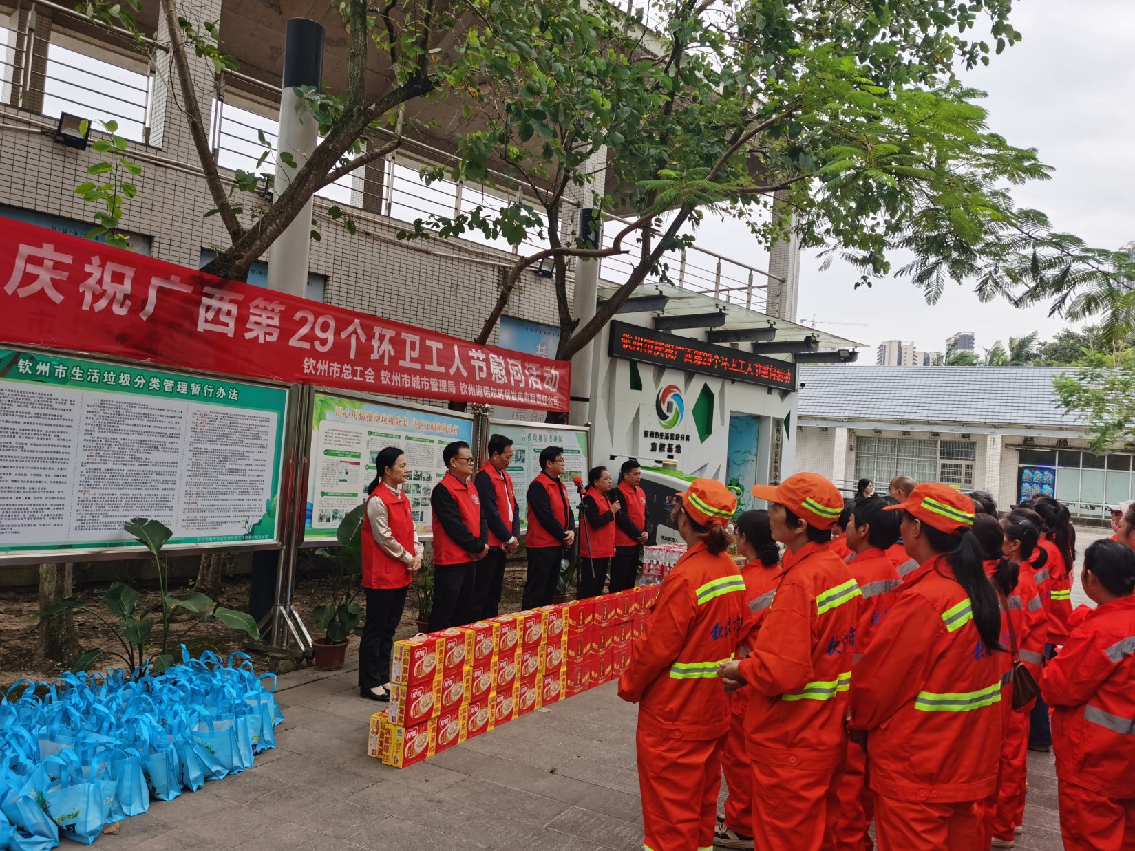 10月23日下午,市城市管理局联合市总工会、钦州海诺尔公司,在钦州市生活垃圾分类宣教基地(白石湖喷泉舞台旁)隆重开展环卫工人节慰问活动。市城市管理局、市总工会、市环卫处、钦州海诺尔公司有关领导,中马产业园区及钦南区、钦北区100多名环卫工人代表共同参加活动。有关领导先后发言,分别从行业管理、工会关怀、企业协作等角度,表达了对环卫工人的深切关爱,并表示将持续加大支持力度,改善环卫工人的工作生活条件,并为参加活动环卫工人代表米、油、清凉饮品等慰问品,将节日的祝福和温暖精准传递到环卫工人心中。
