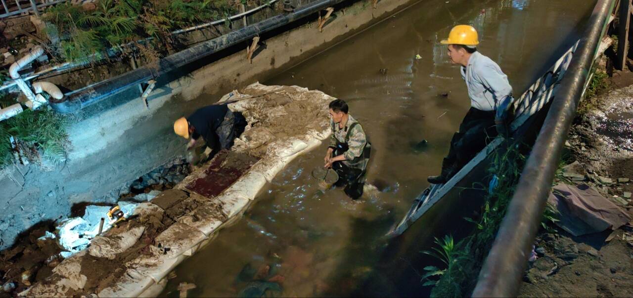 图为市政工人正在对南珠市场旁西干渠排污暗涵塌方进行日夜抢修