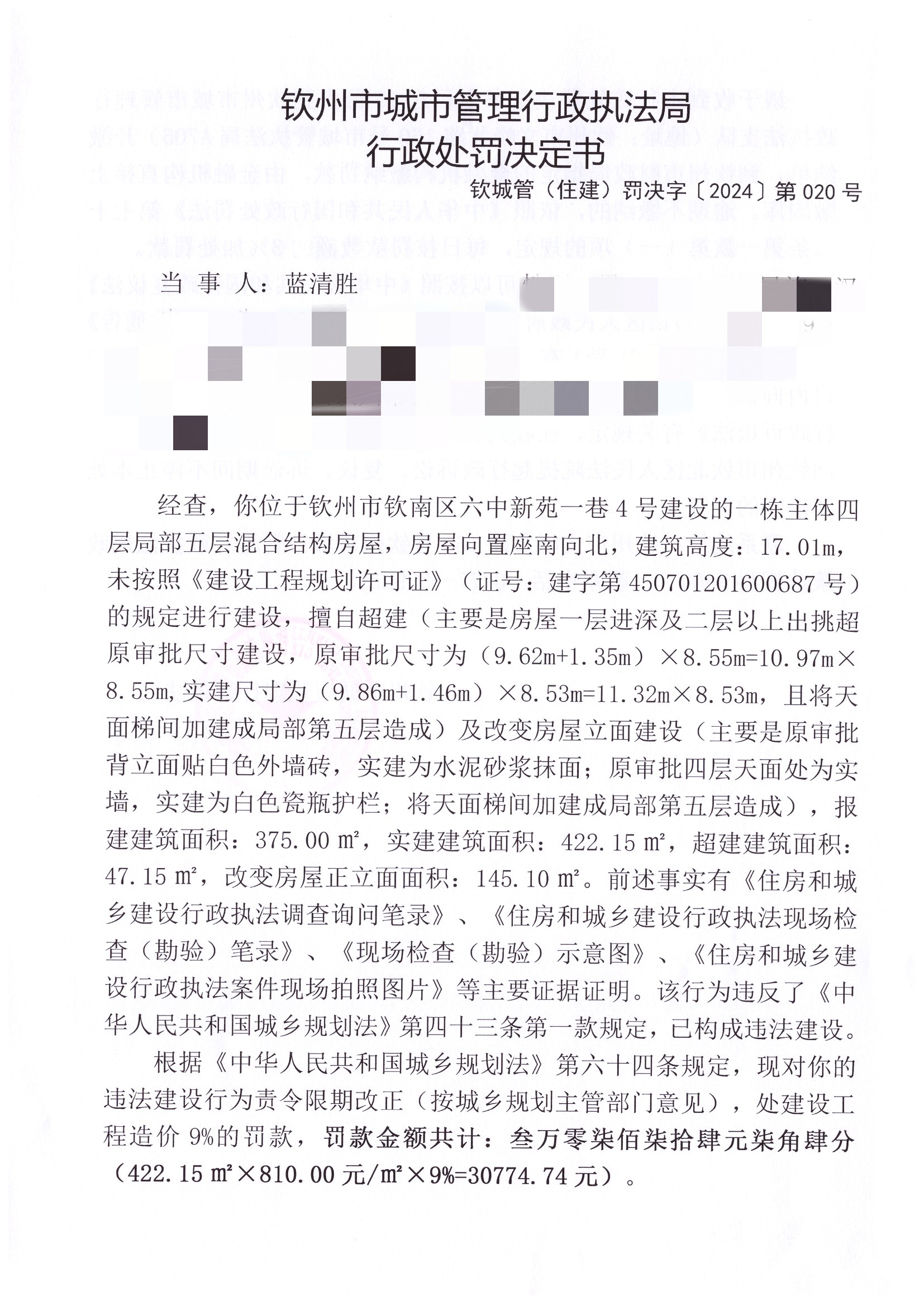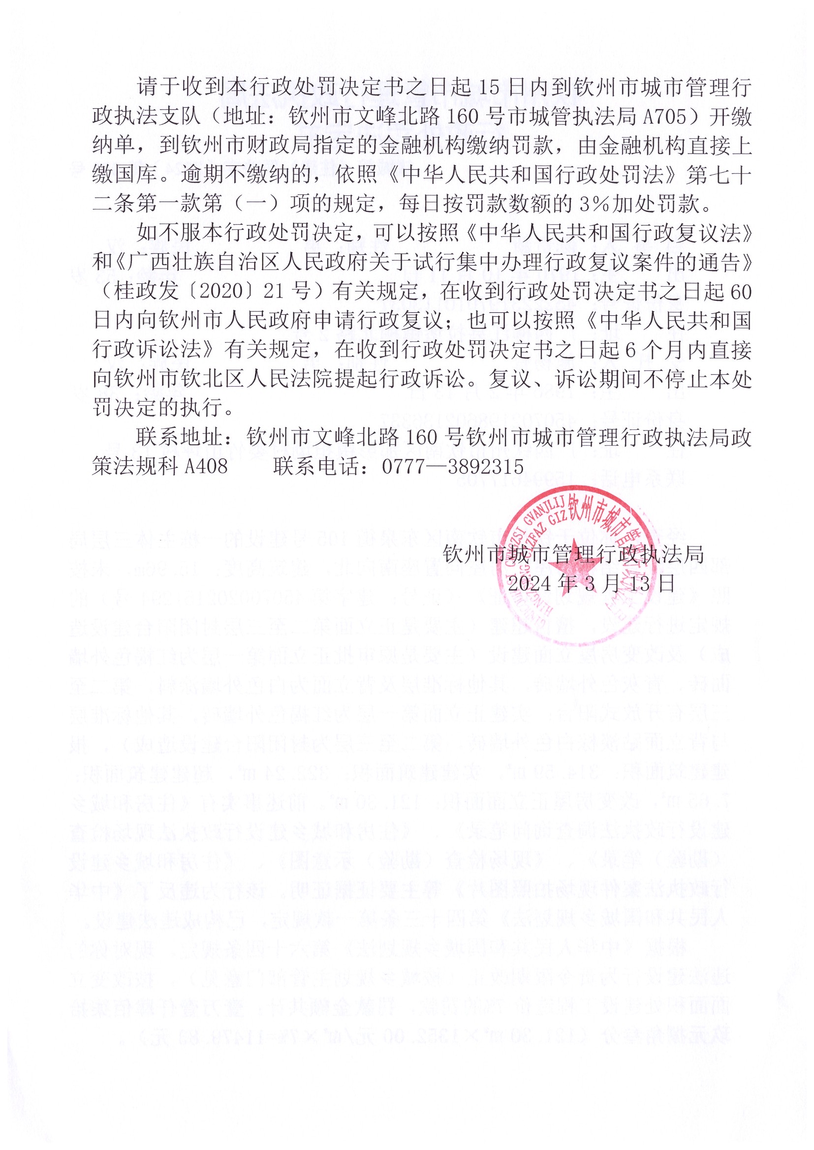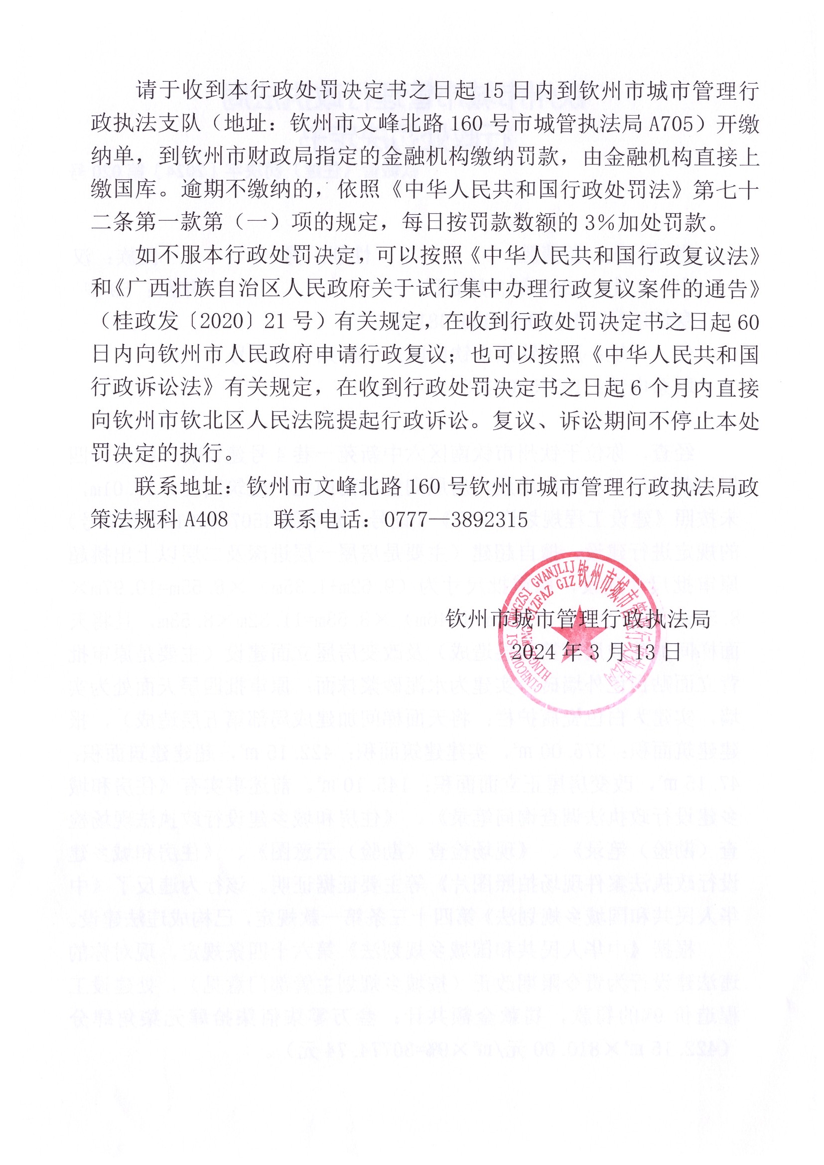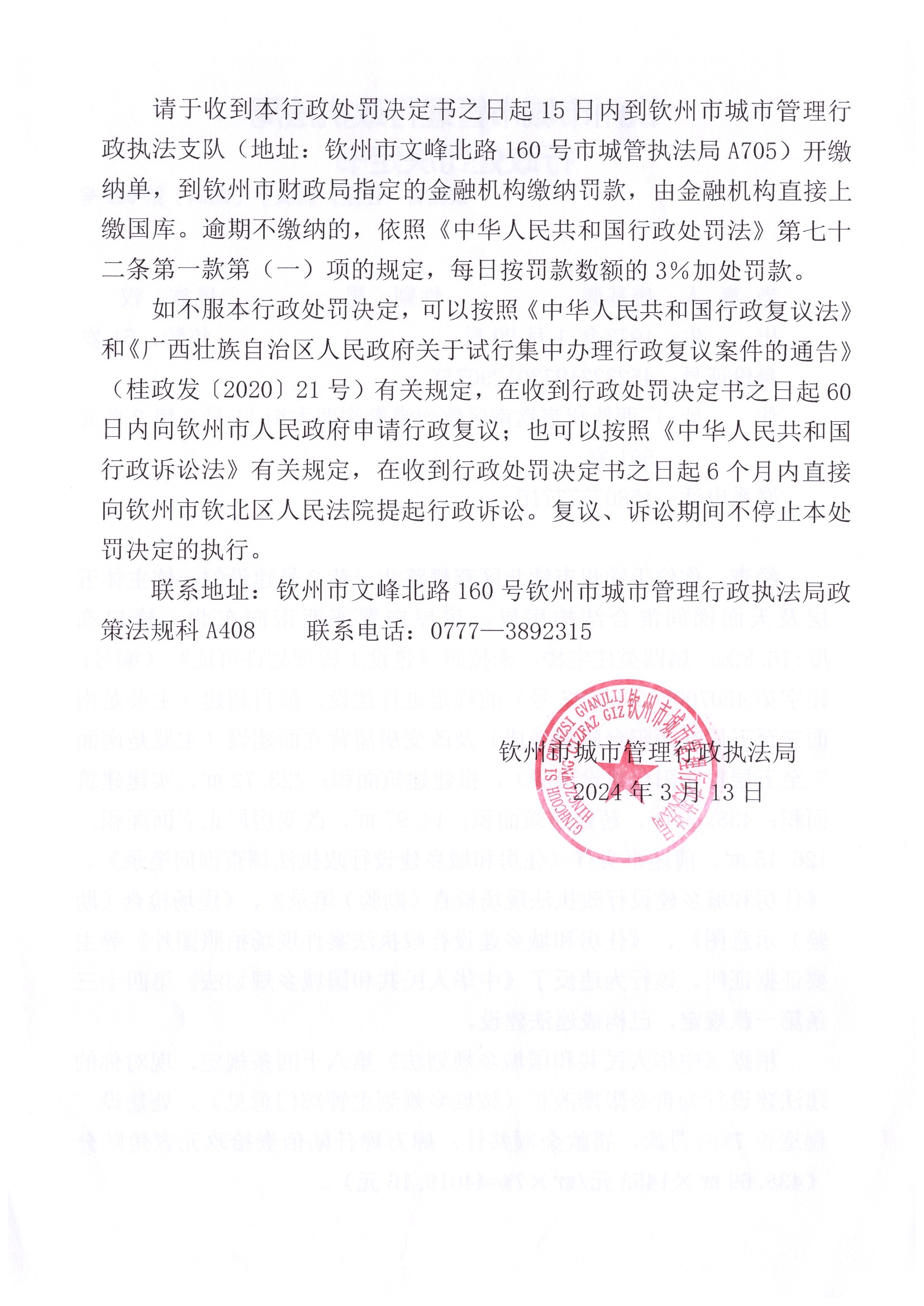 钦城管(住建)罚决字〔2024〕第020号 |