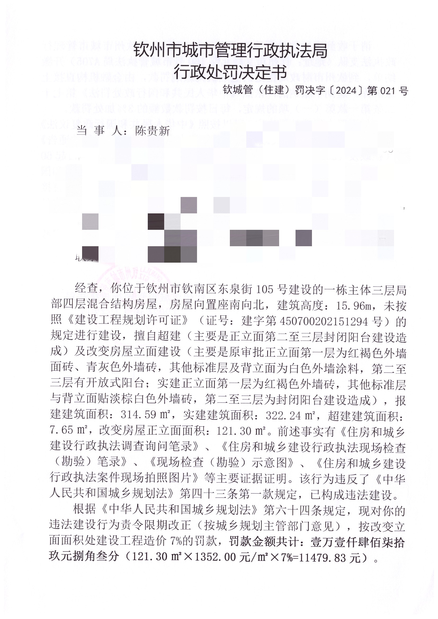 钦城管(住建)罚决字〔2024〕第021号 |