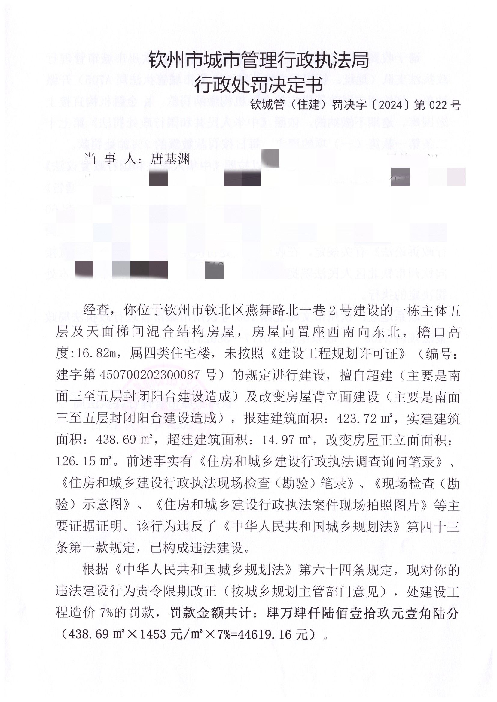 钦城管(住建)罚决字〔2024〕第022号 |