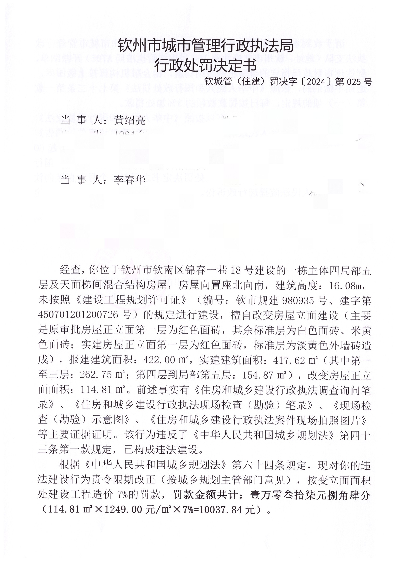 钦城管(住建)罚决字〔2024〕第025号 |
