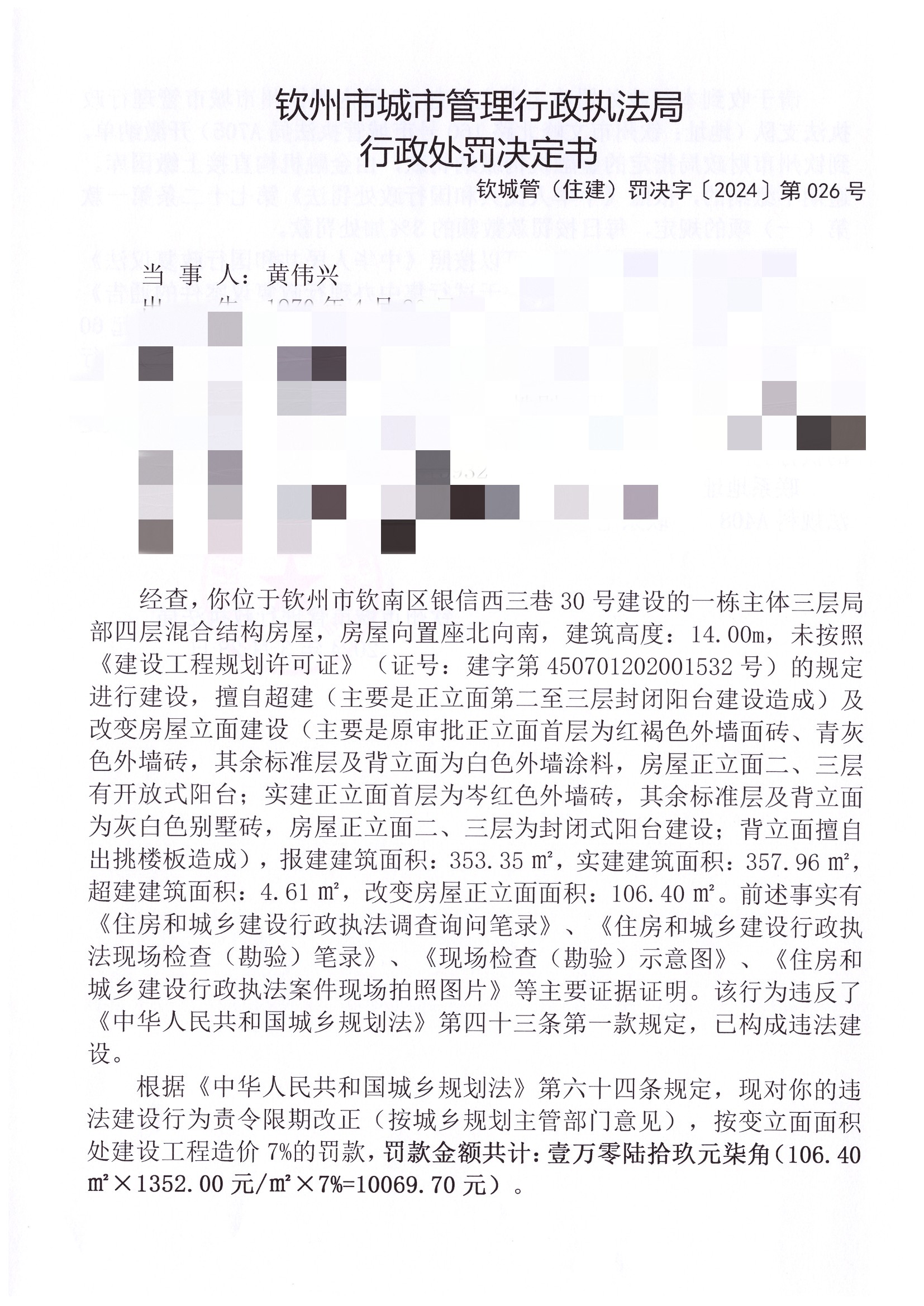 钦城管(住建)罚决字〔2024〕第026号 |