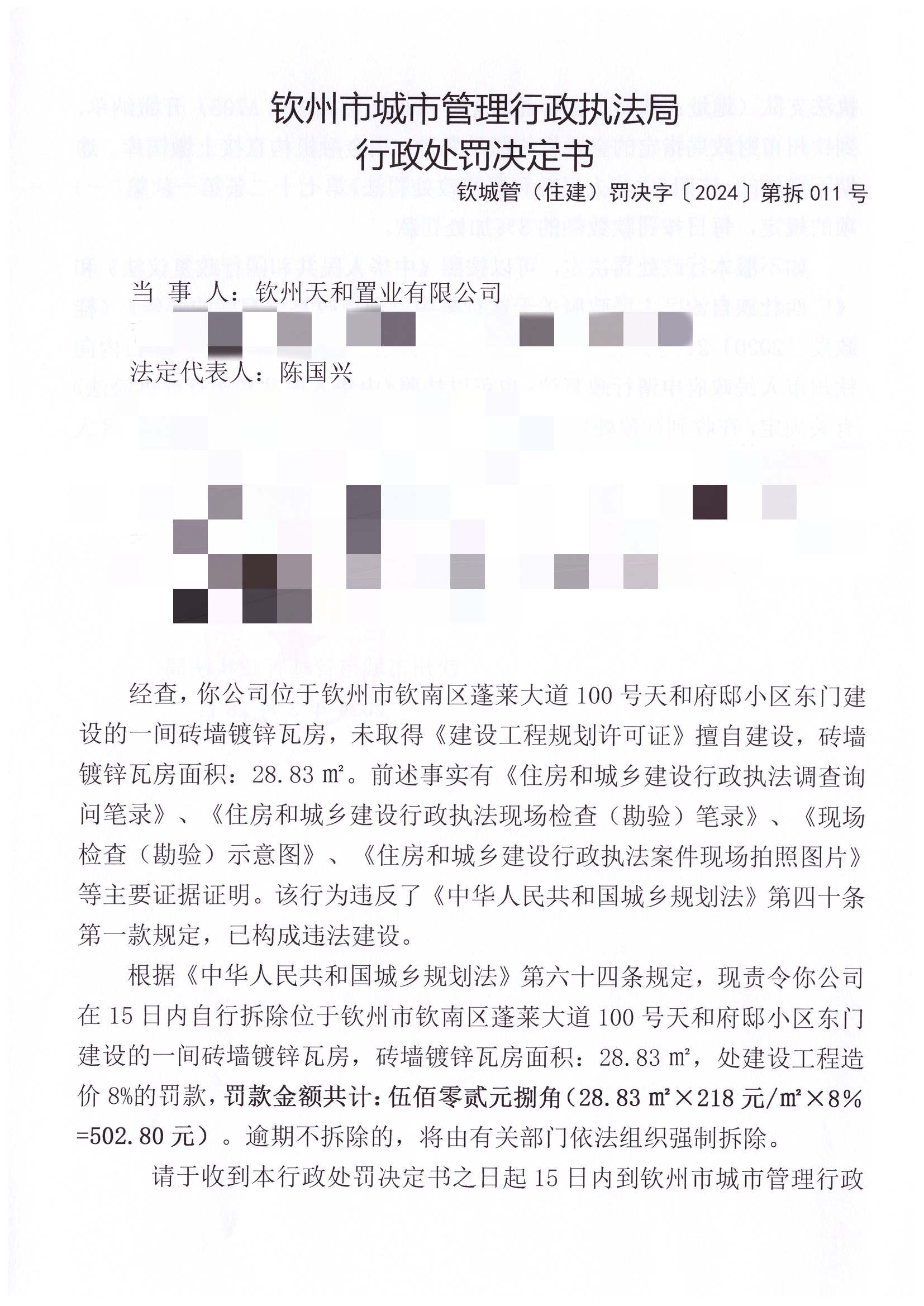 钦城管(住建)罚决字〔2024〕第拆011号 |