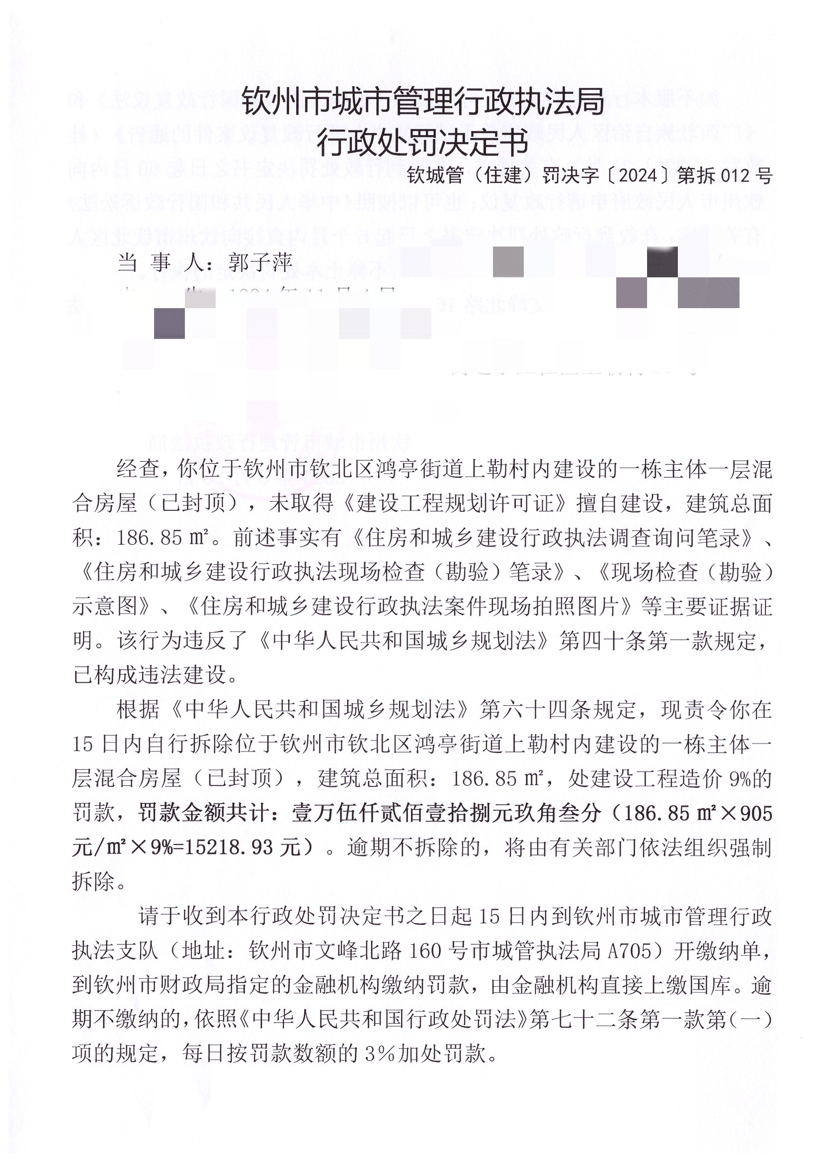 钦城管(住建)罚决字〔2024〕第拆012号 |