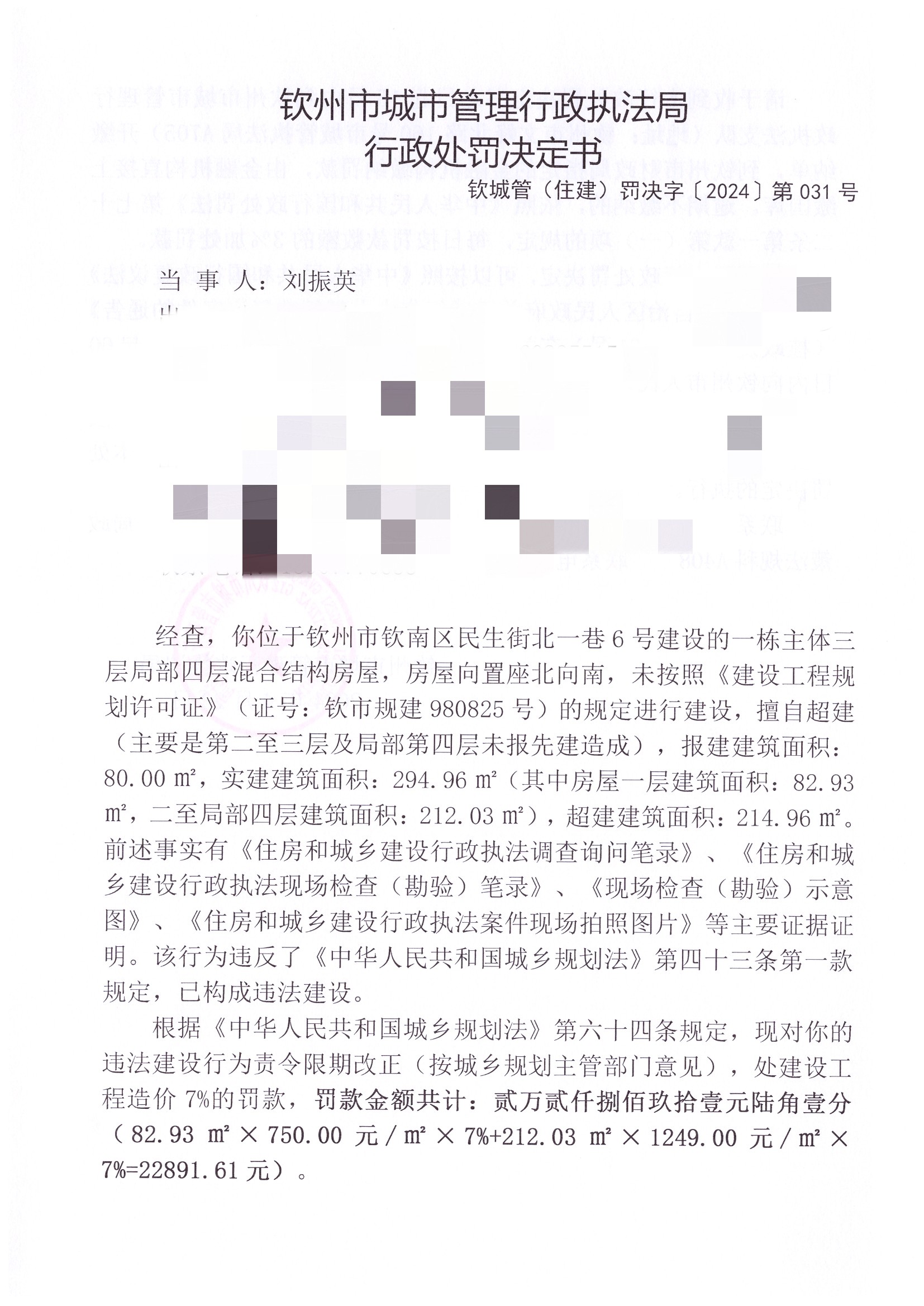 钦城管(住建)罚决字〔2024〕第031号 |