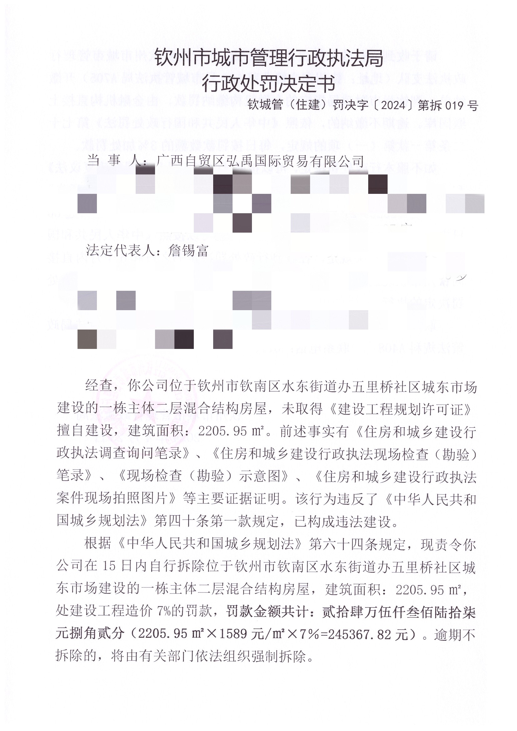 钦城管(住建)罚决字〔2024〕第拆019号 |