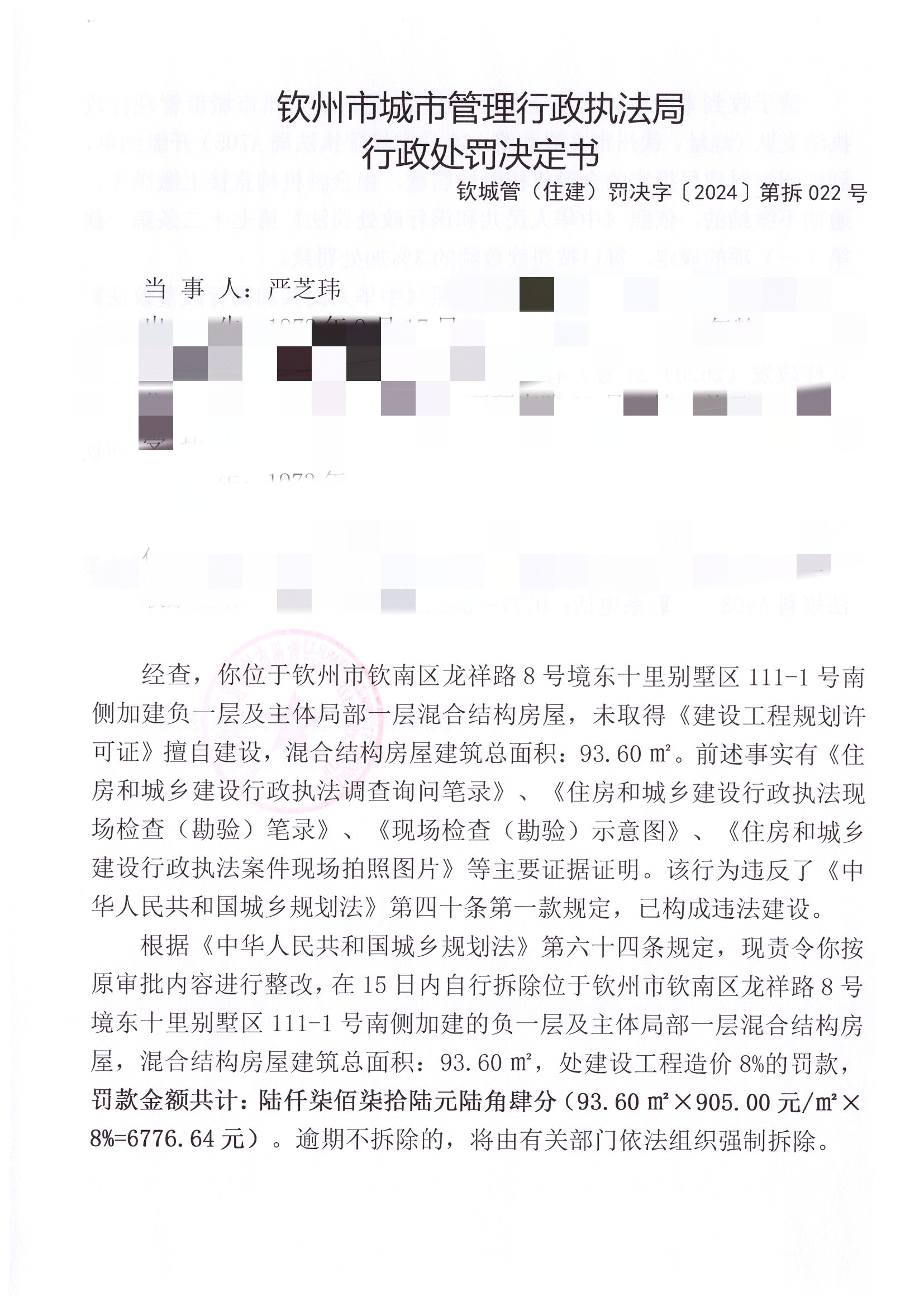 钦城管(住建)罚决字﹝2024﹞第拆022号 |