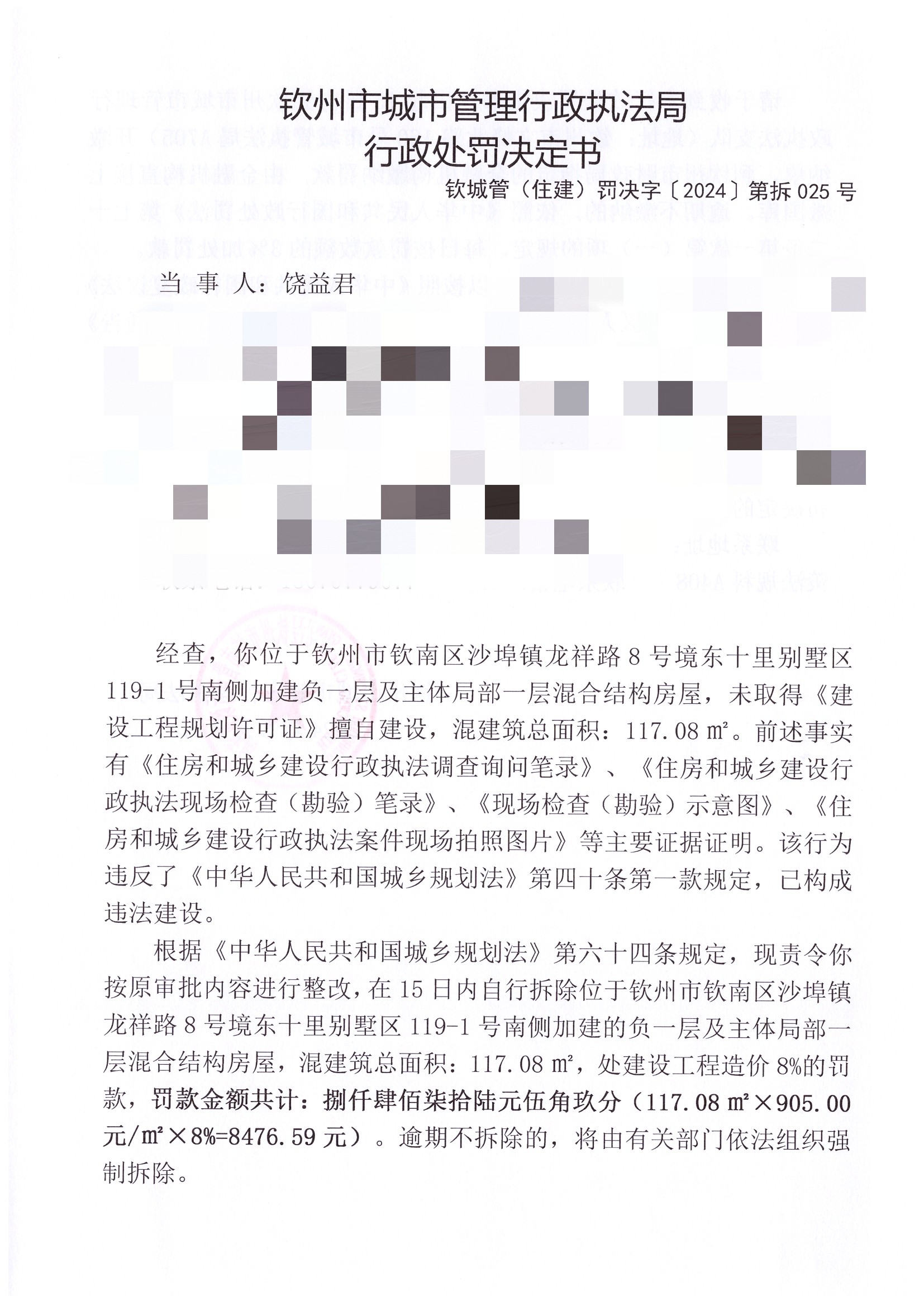 钦城管(住建)罚决字﹝2024﹞第拆025号 |