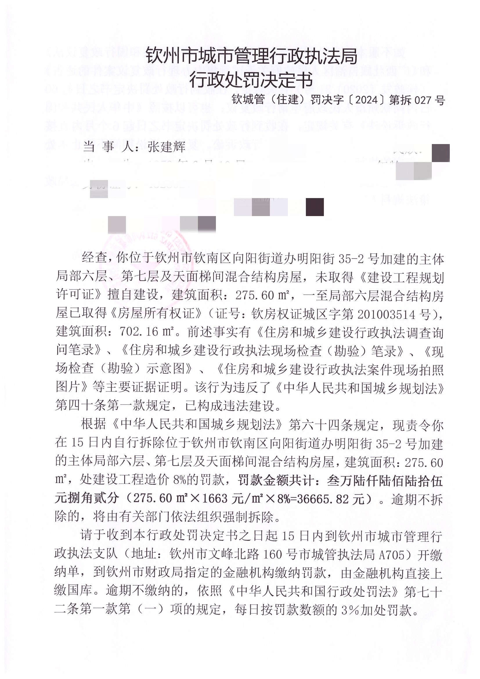 钦城管(住建)罚决字﹝2024﹞第拆027号 |