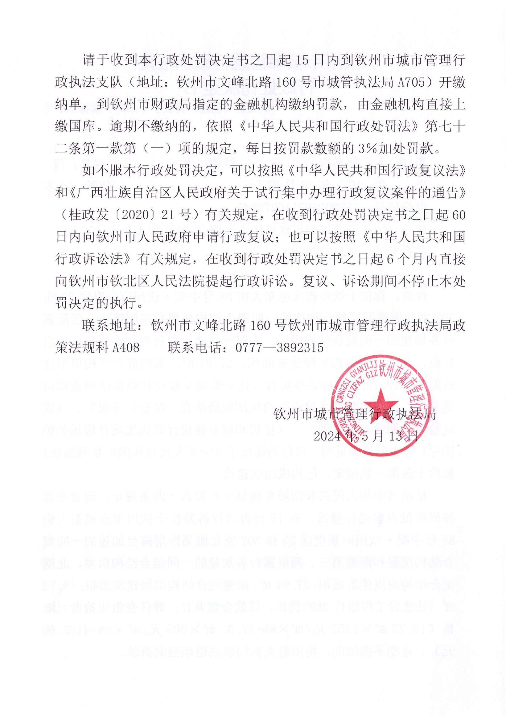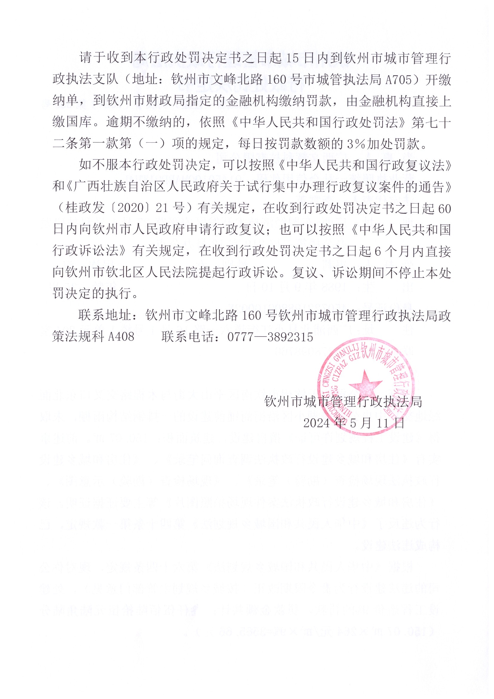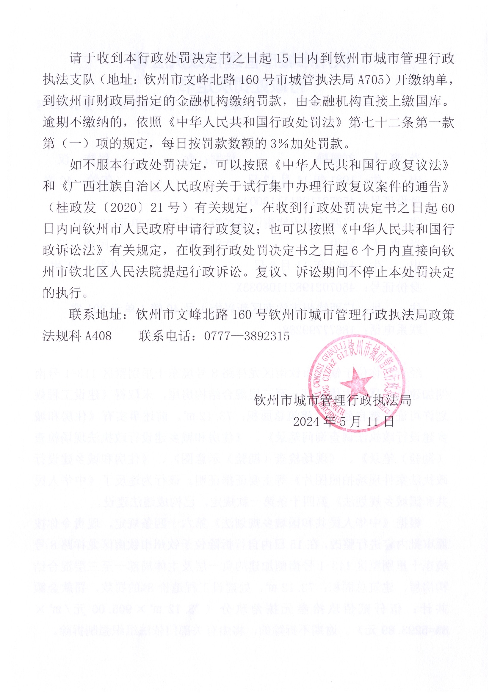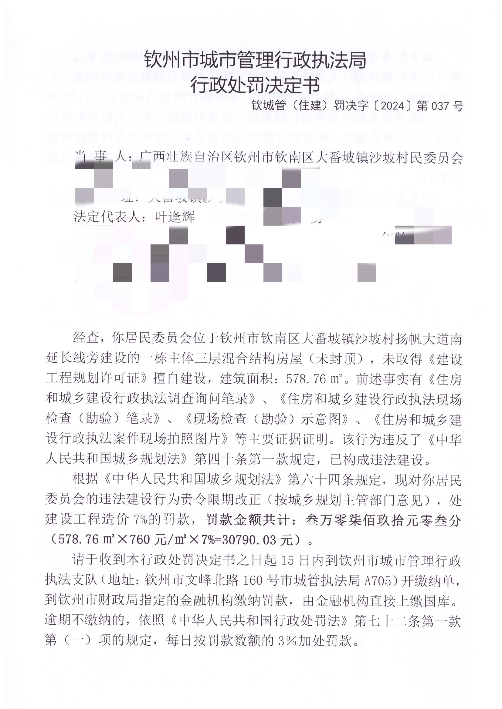 钦城管(住建)罚决字〔2024〕第037号 |