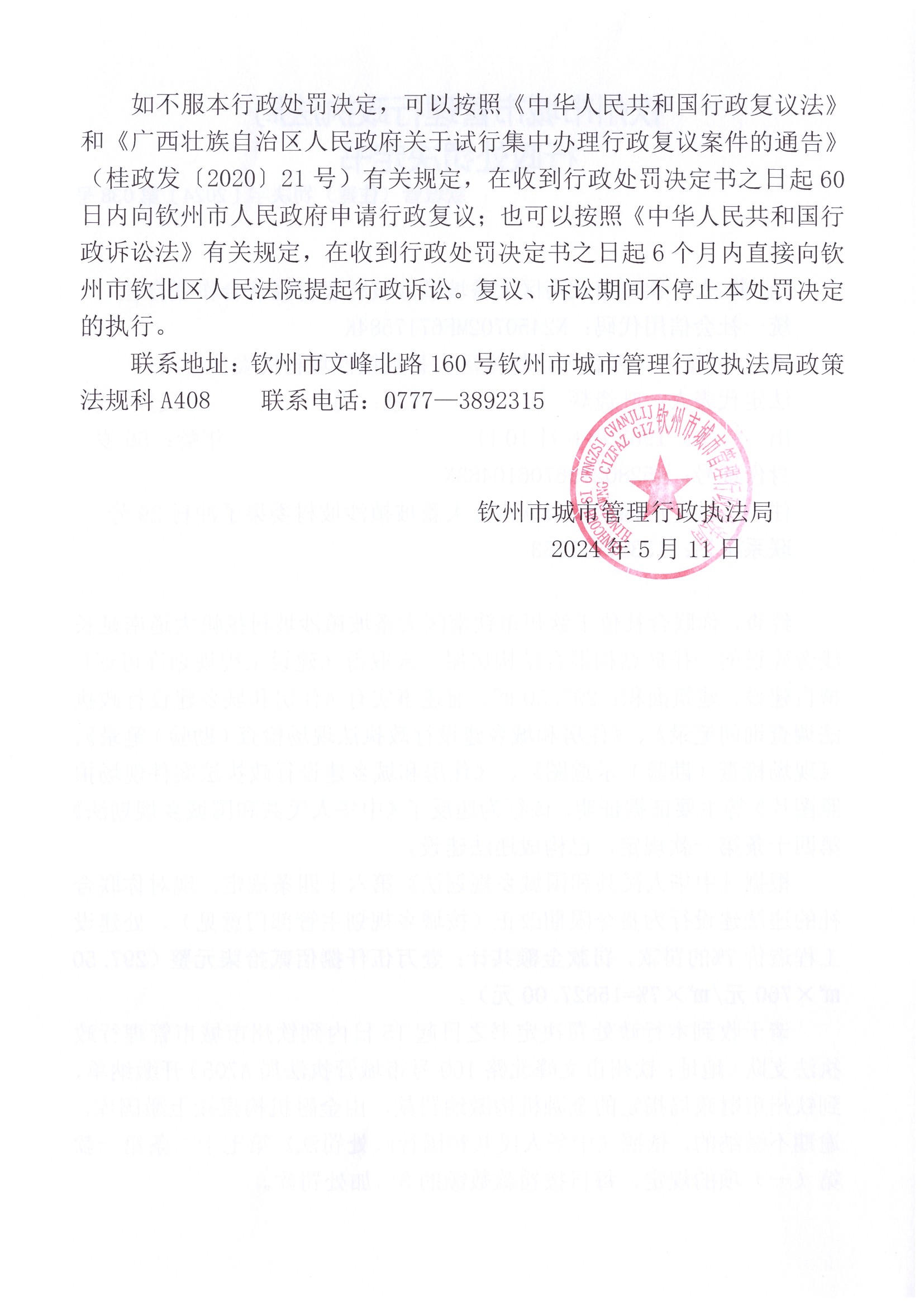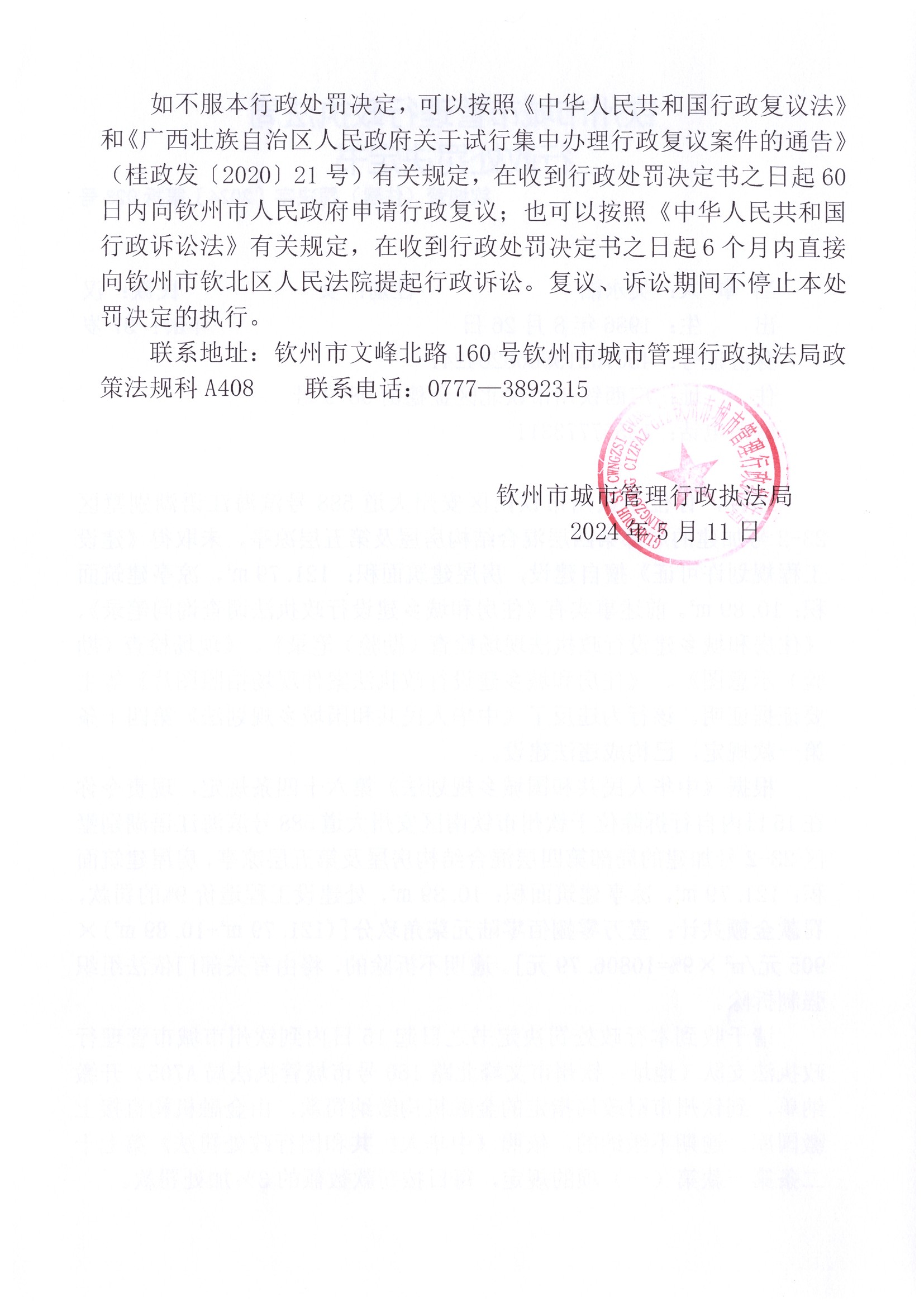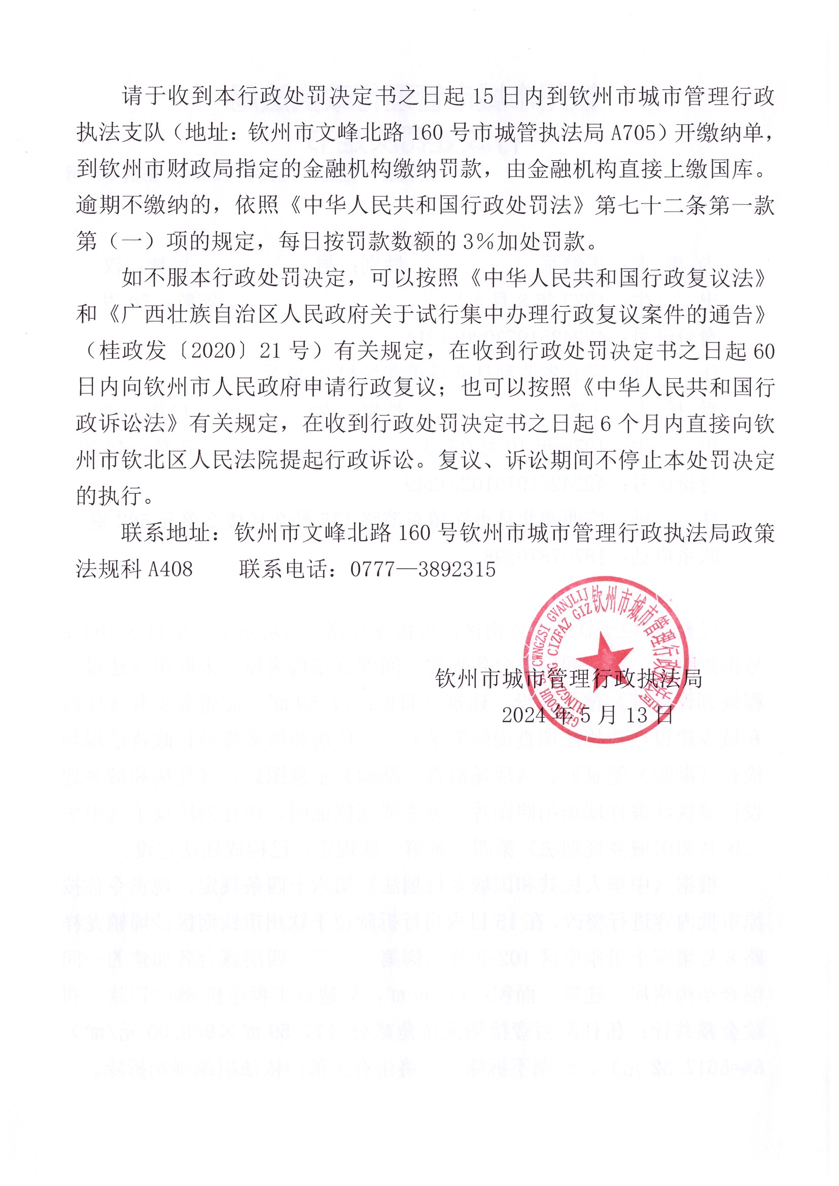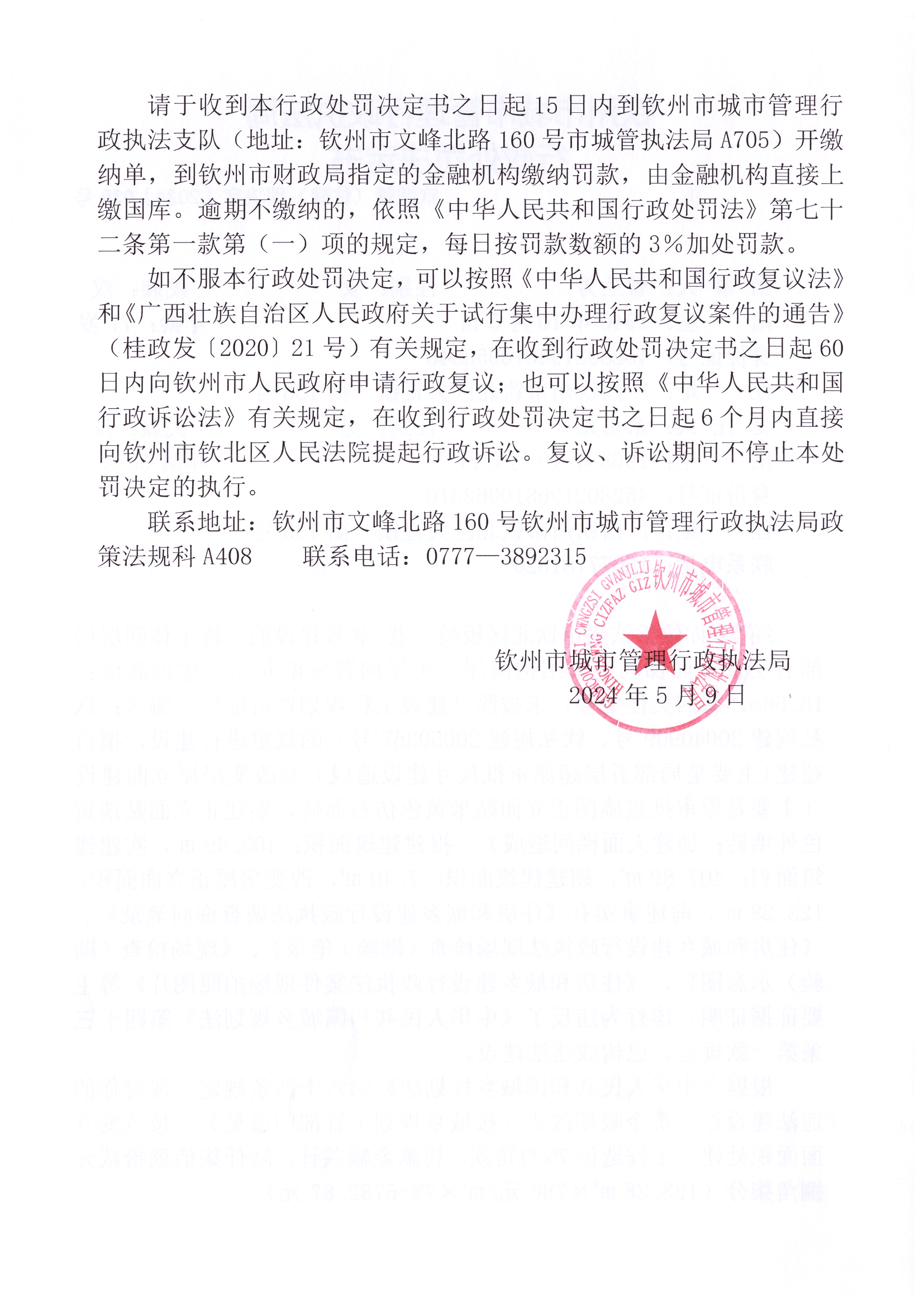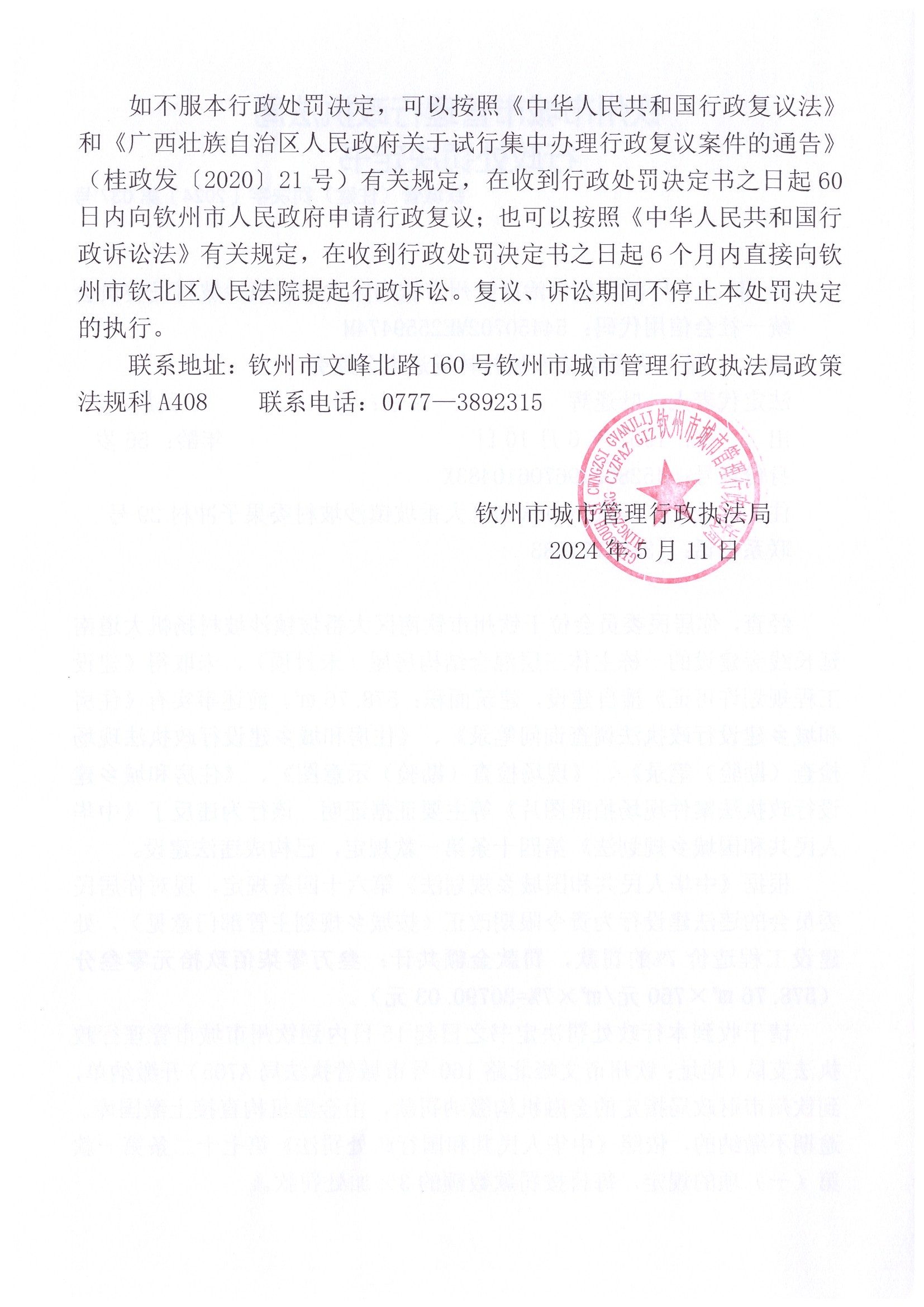 钦城管(住建)罚决字〔2024〕第037号 |