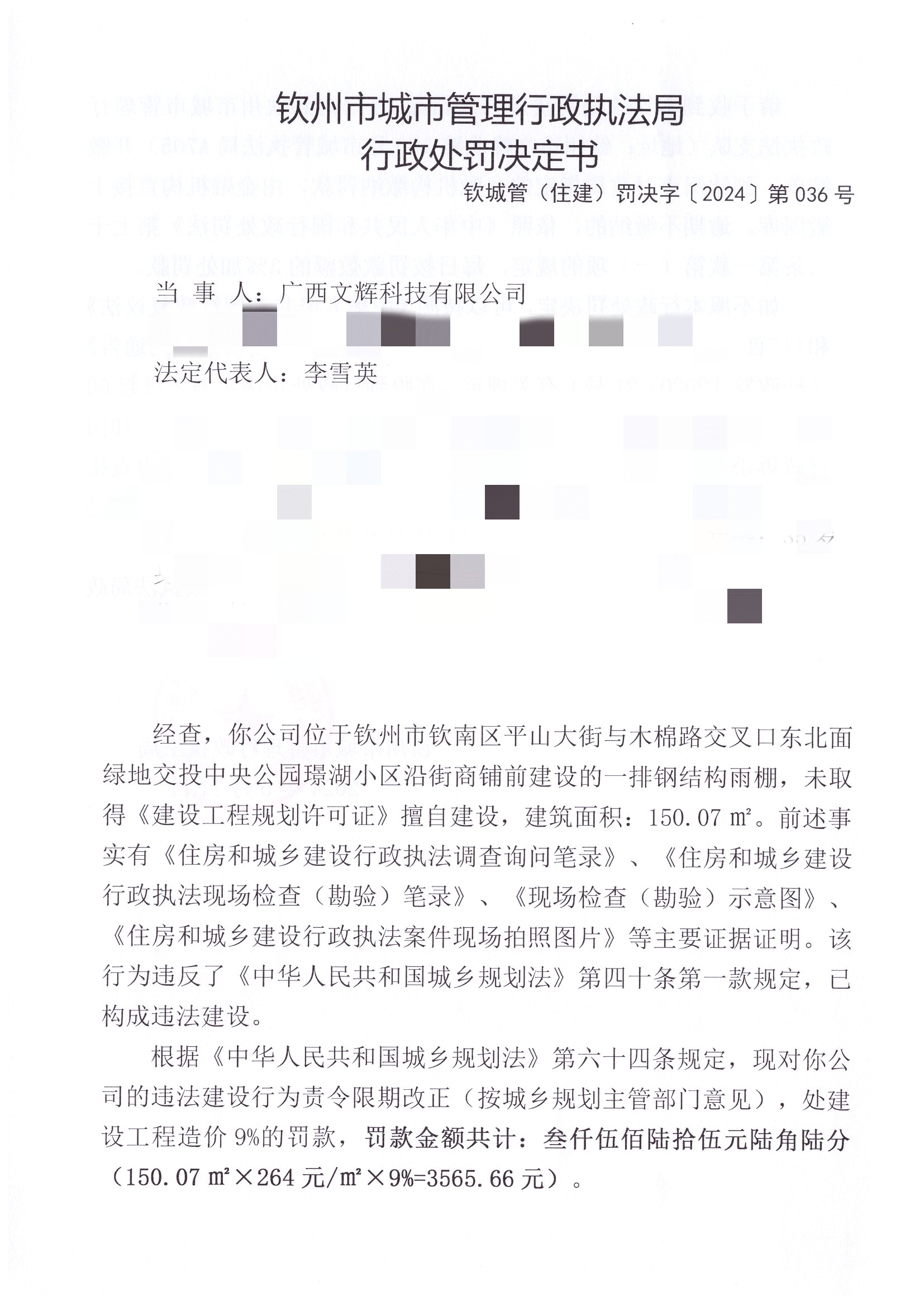 钦城管(住建)罚决字〔2024〕第036号 |