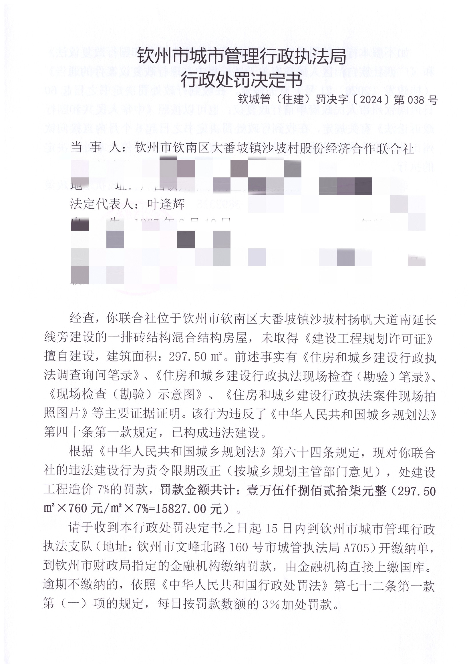 钦城管(住建)罚决字〔2024〕第038号 |