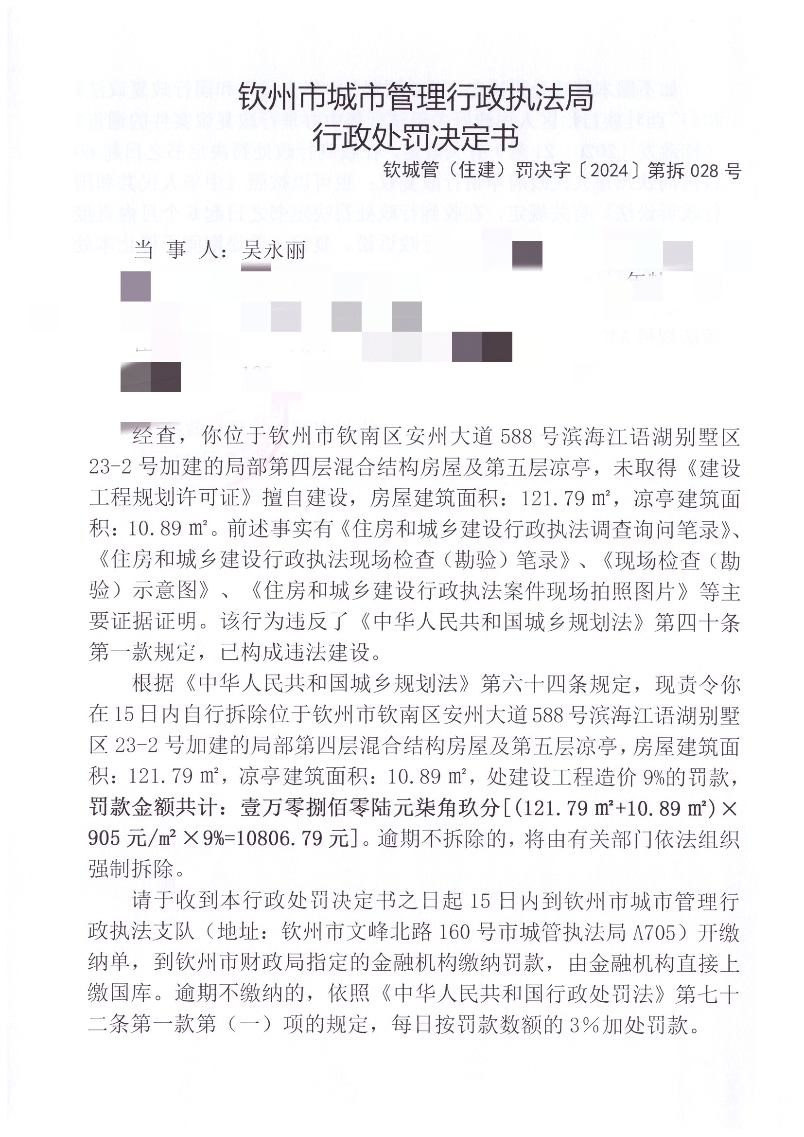 限期15日内自行拆除擅自加建的局部第四层混合结构房屋及第五层凉亭,房屋建筑面积:121.79㎡,凉亭建筑面积:10.89㎡,处罚款10806.79元 |