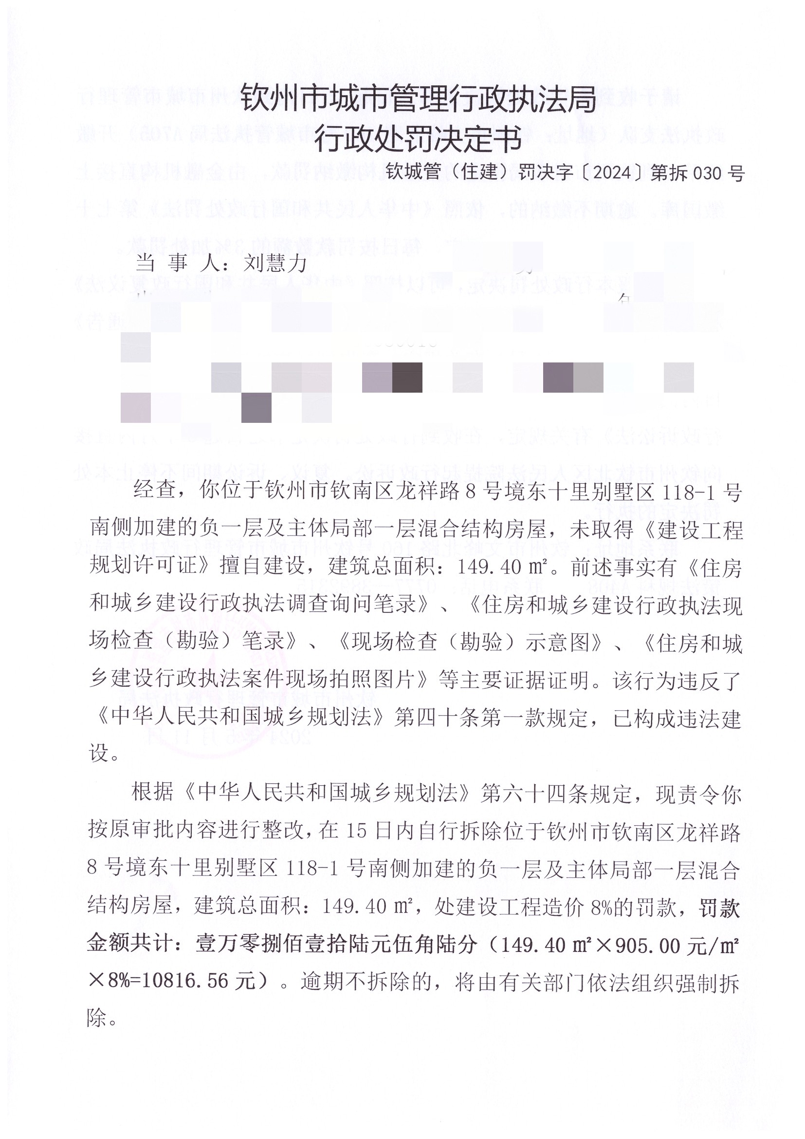 责令按原审批内容进行整改,在15日内自行拆除位于钦州市钦南区龙祥路8号境东十里别墅区118-1号南侧加建的负一层及主体局部一层混合结构房屋,建筑总面积:149.40㎡,罚款10816.56元 |