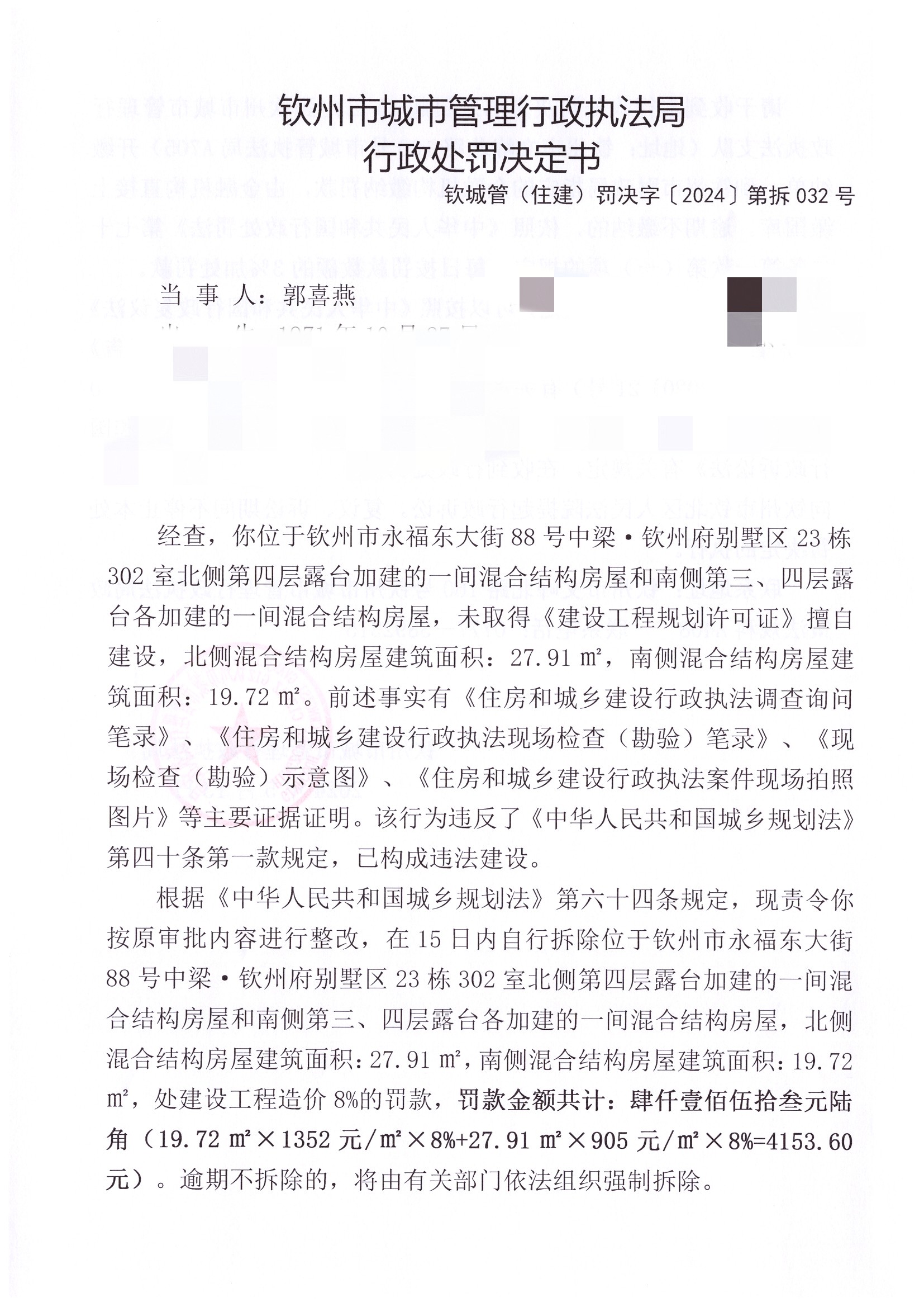 责令按原审批内容进行整改,在15日内自行拆除位于钦州市永福东大街88号中梁·钦州府别墅区23栋302室北侧第四层露台加建的一间混合结构房屋和南侧第三、四层露台各加建的一间混合结构房屋,北侧混合结构房屋建筑面积:27.91㎡,南侧混合结构房屋建筑面积:19.72㎡,罚款4153.60元 |