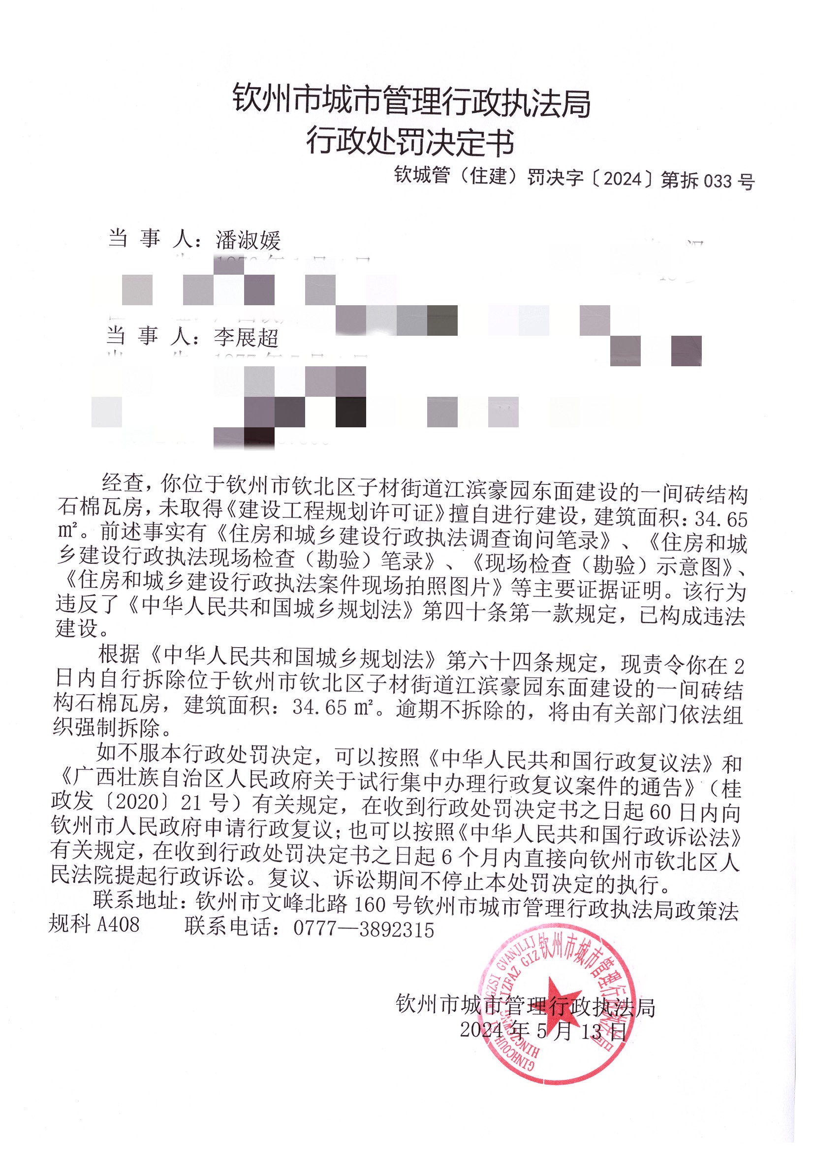 钦城管(住建)罚决字﹝2024﹞第拆033号 |