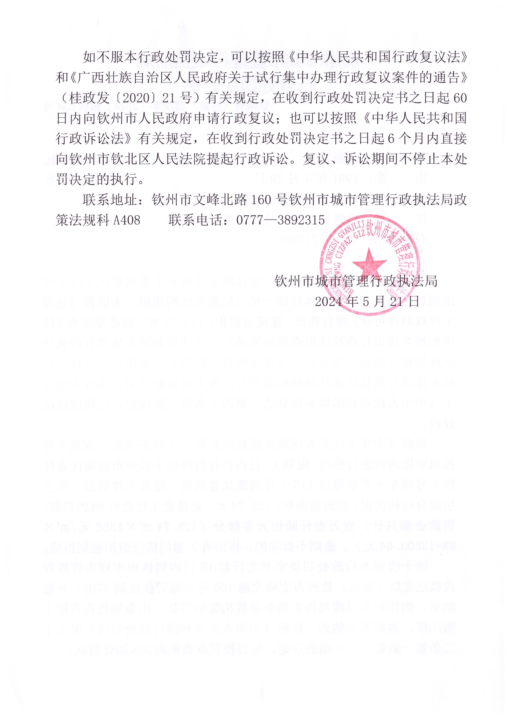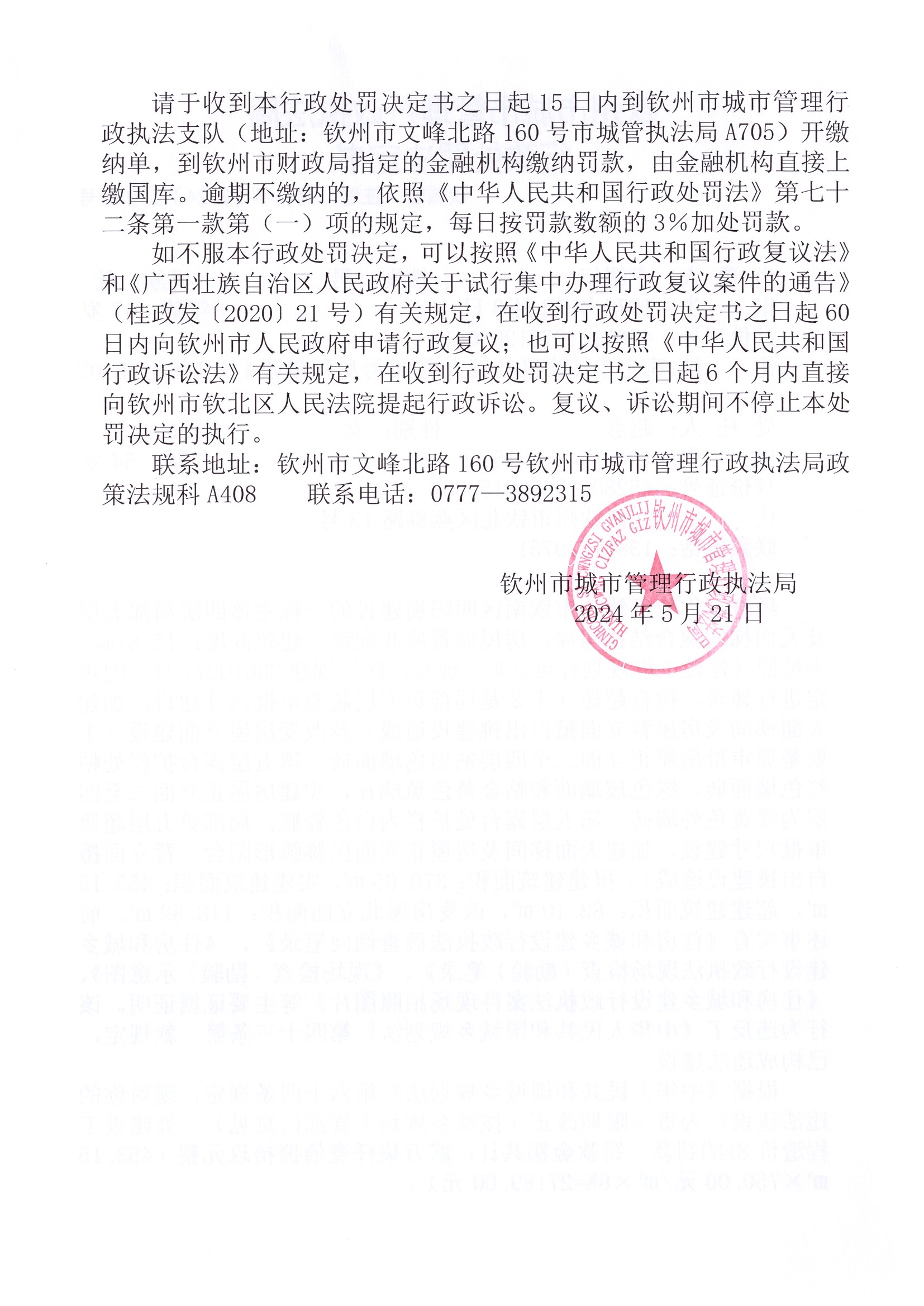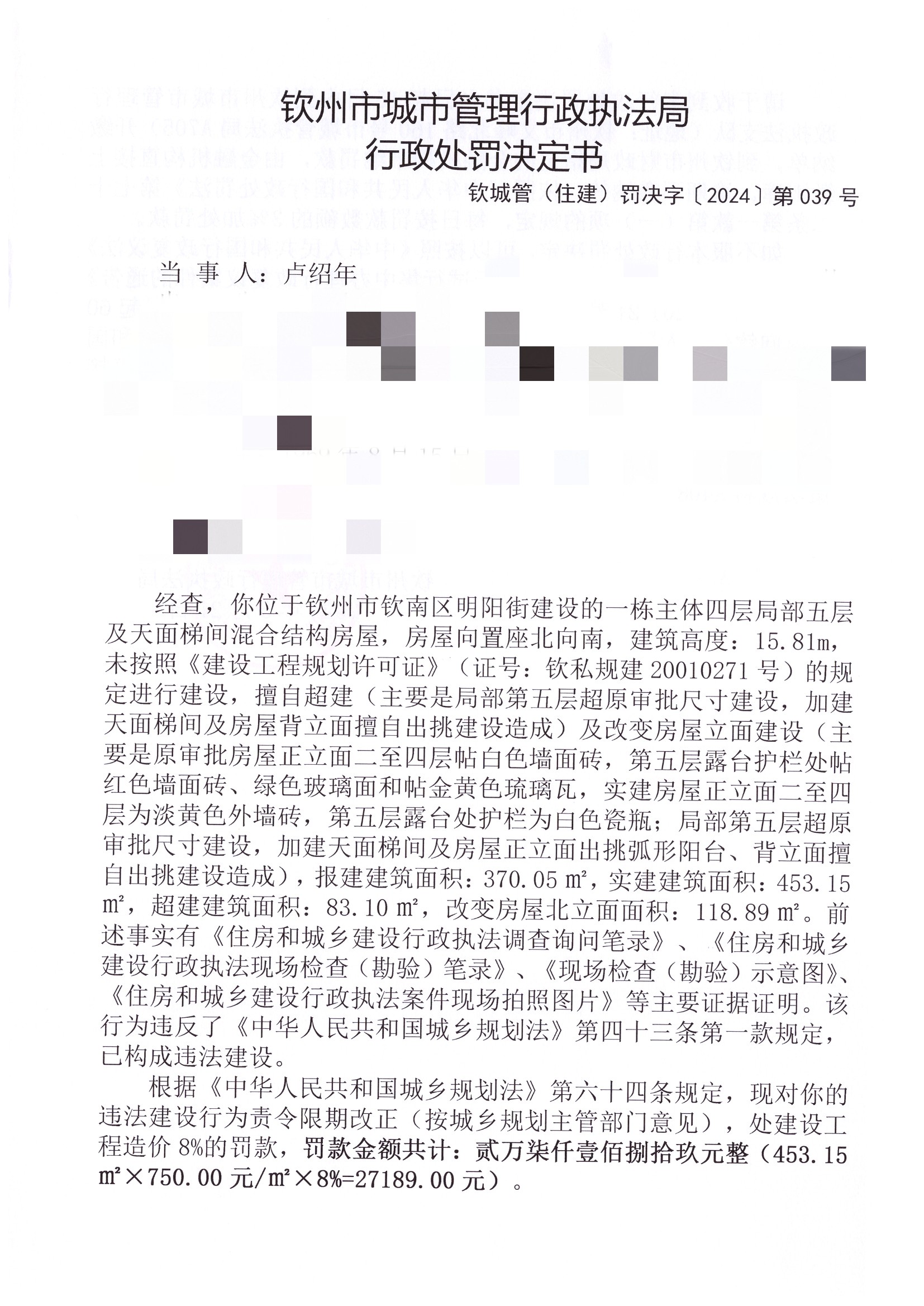 钦城管(住建)罚决字﹝2024﹞第039号 |