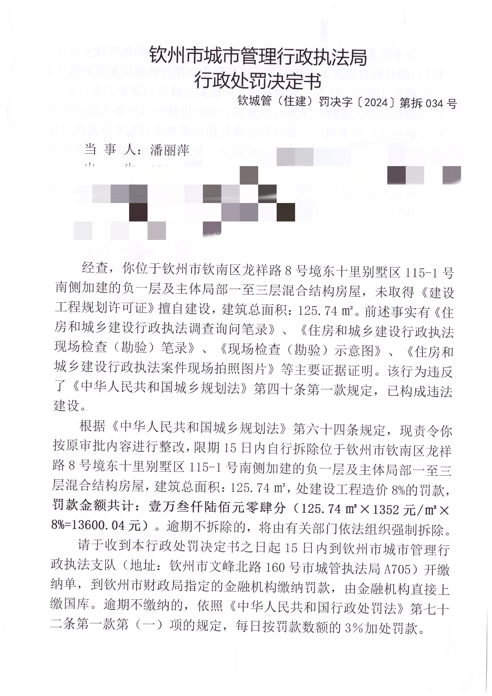 责令按原审批内容进行整改,限期15日内自行拆除位于钦州市钦南区龙祥路8号境东十里别墅区115-1号南侧加建的负一层及主体局部一至三层混合结构房屋,建筑总面积:125.74㎡,罚款13600.04元