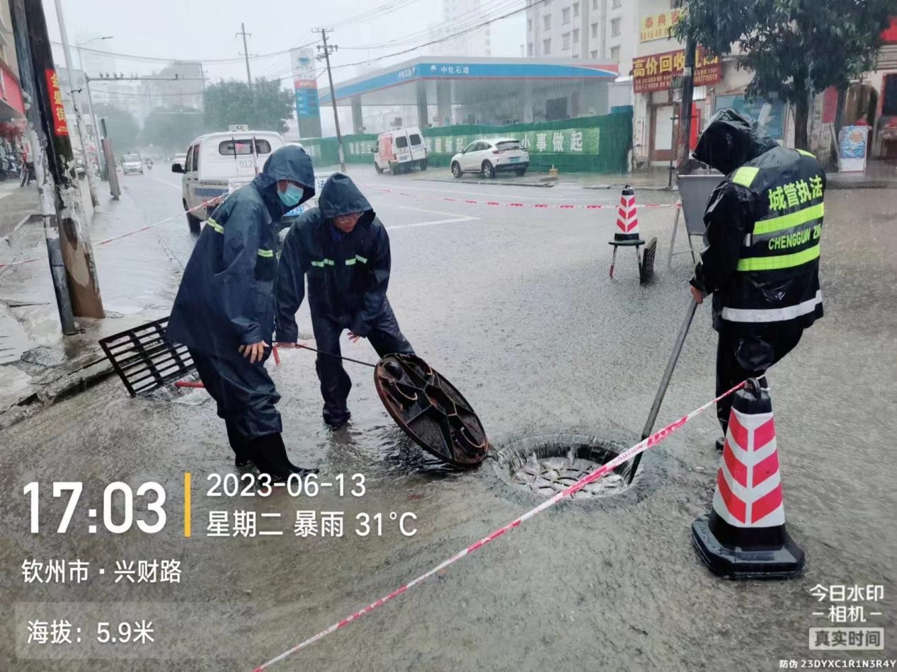 执法人员打开排水井盖排涝