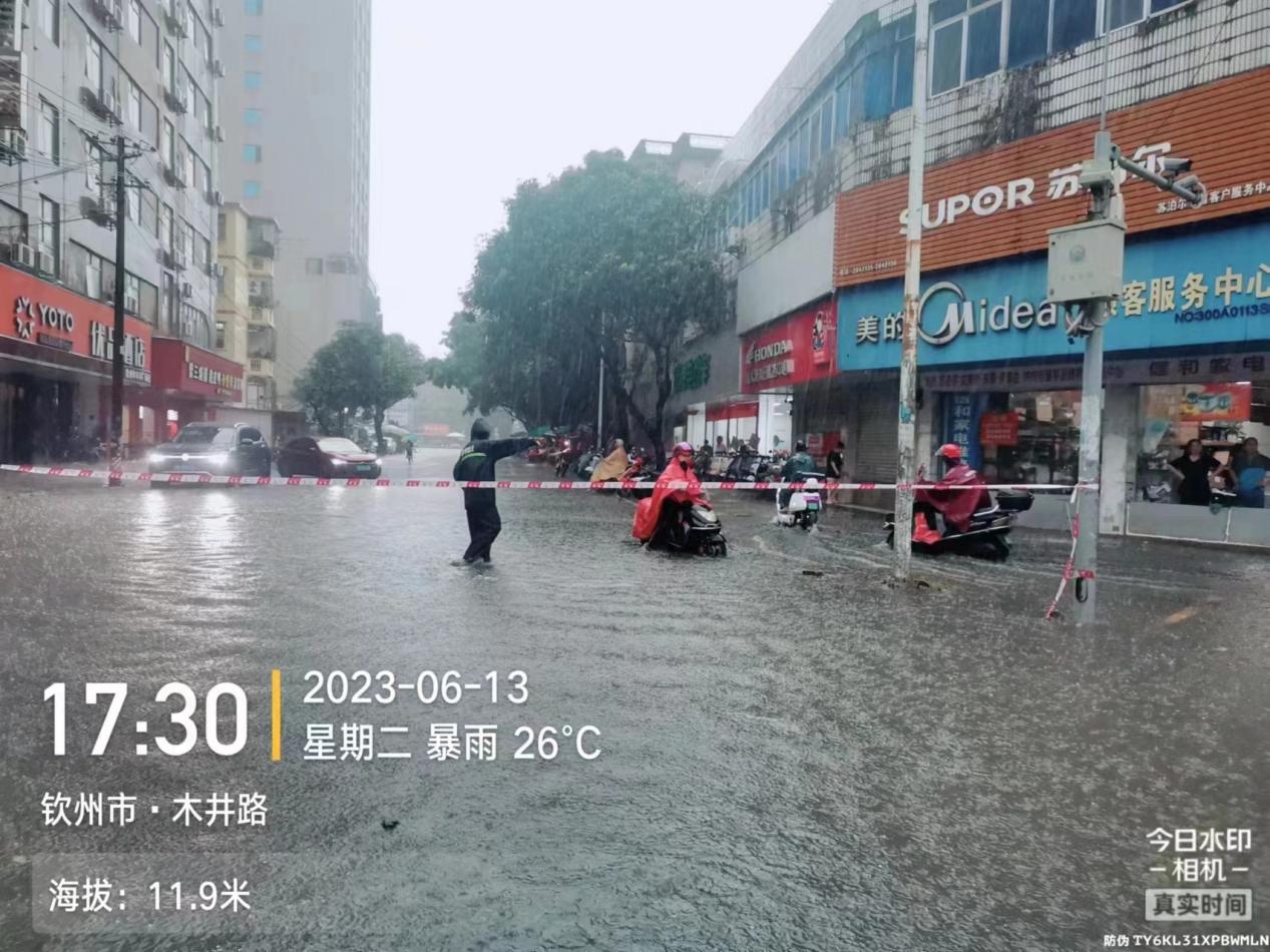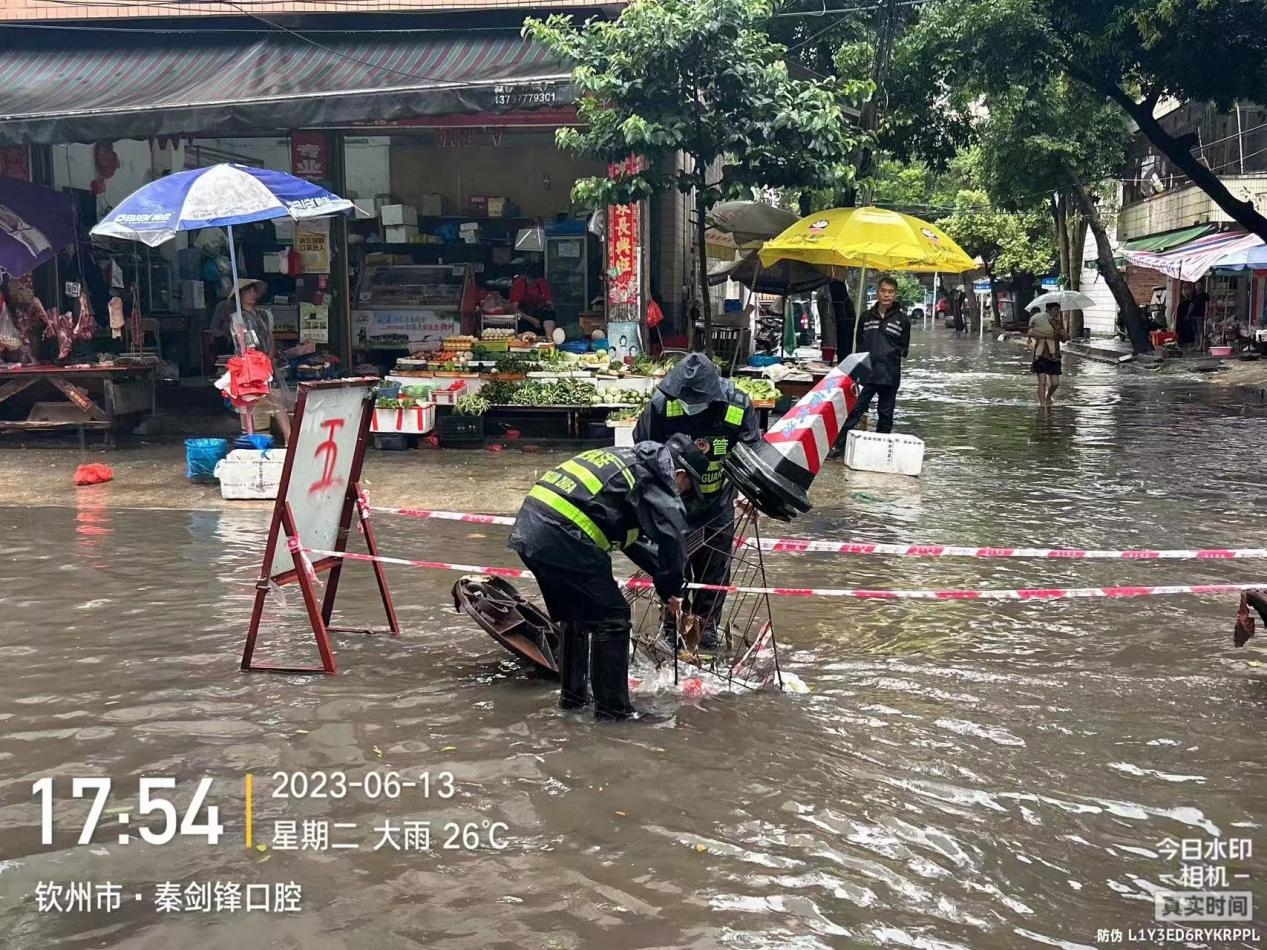 今年进入夏雨季节以来,我市遭遇了多次暴雨天气,造成市区一些低洼路段出现不同程度的积水内涝,给市民带来损失和安全隐患。为做好应急抢险排涝工作,最大限度地降低损失和危害。在暴雨下,来自市城管执法支队的人员坚守在抗涝一线,他们不抱怨不退缩,在街面上筑牢一道道排涝抢险屏障,确保城区安全度汛。