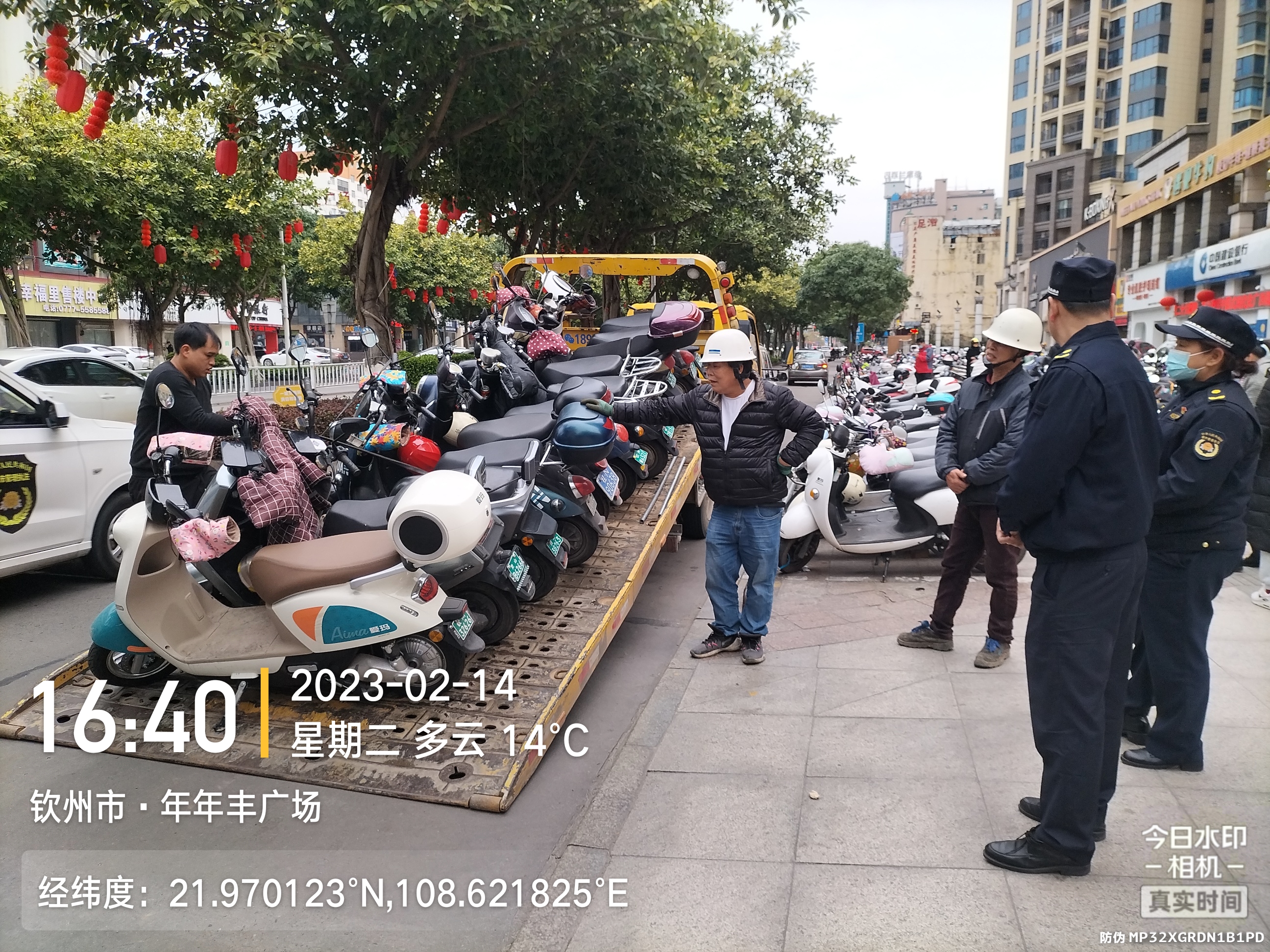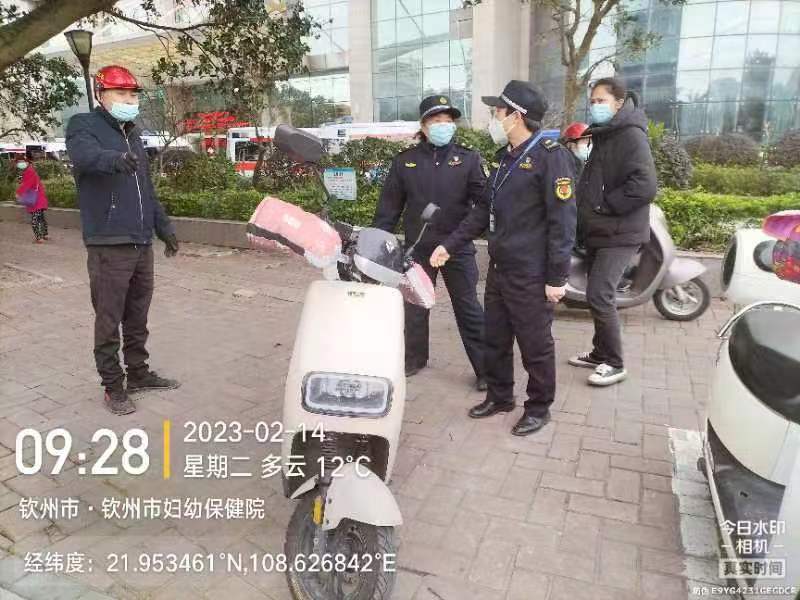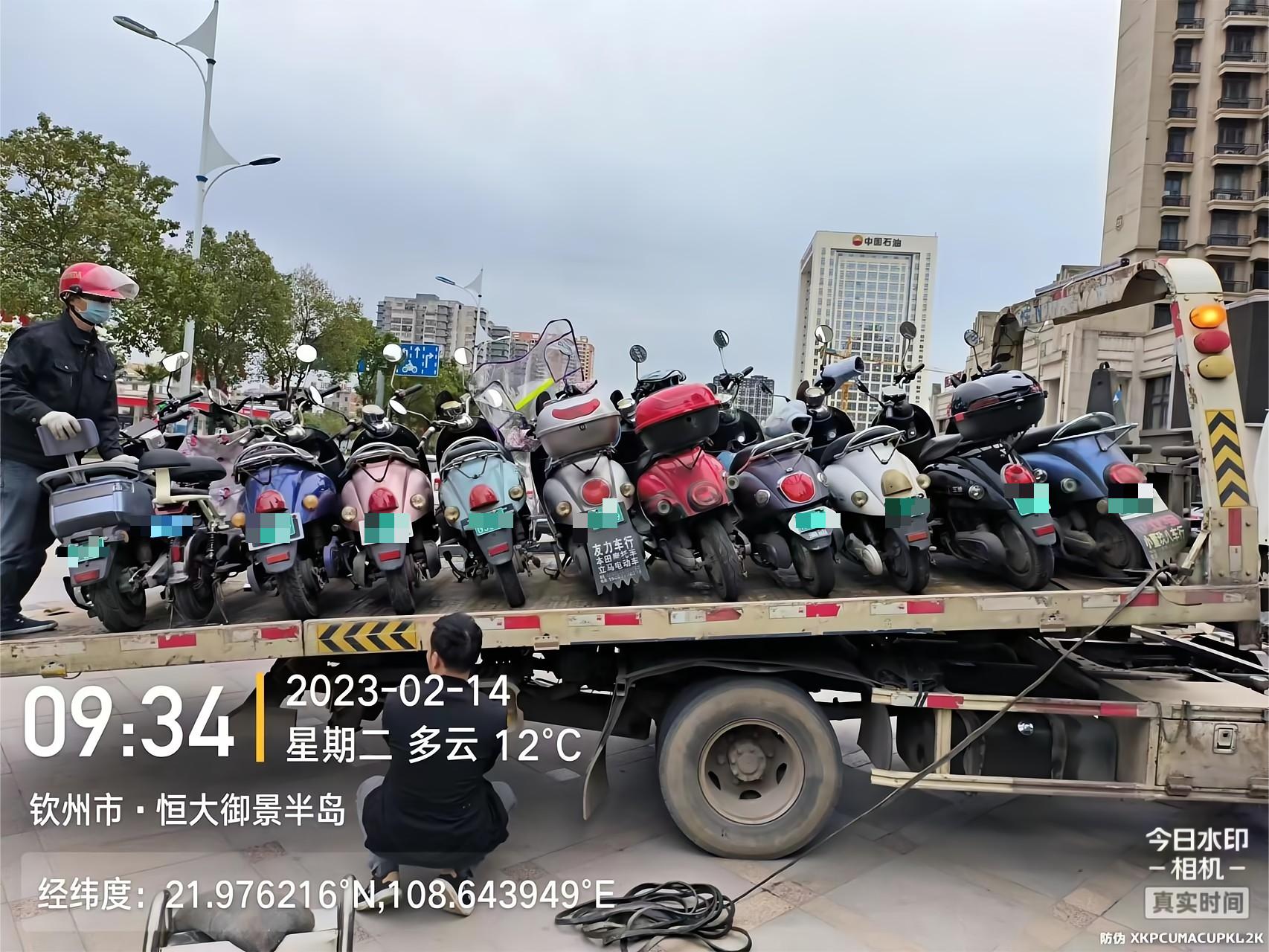执法人员整治车辆乱停乱放,现场拖离两轮电动车辆的工作照片