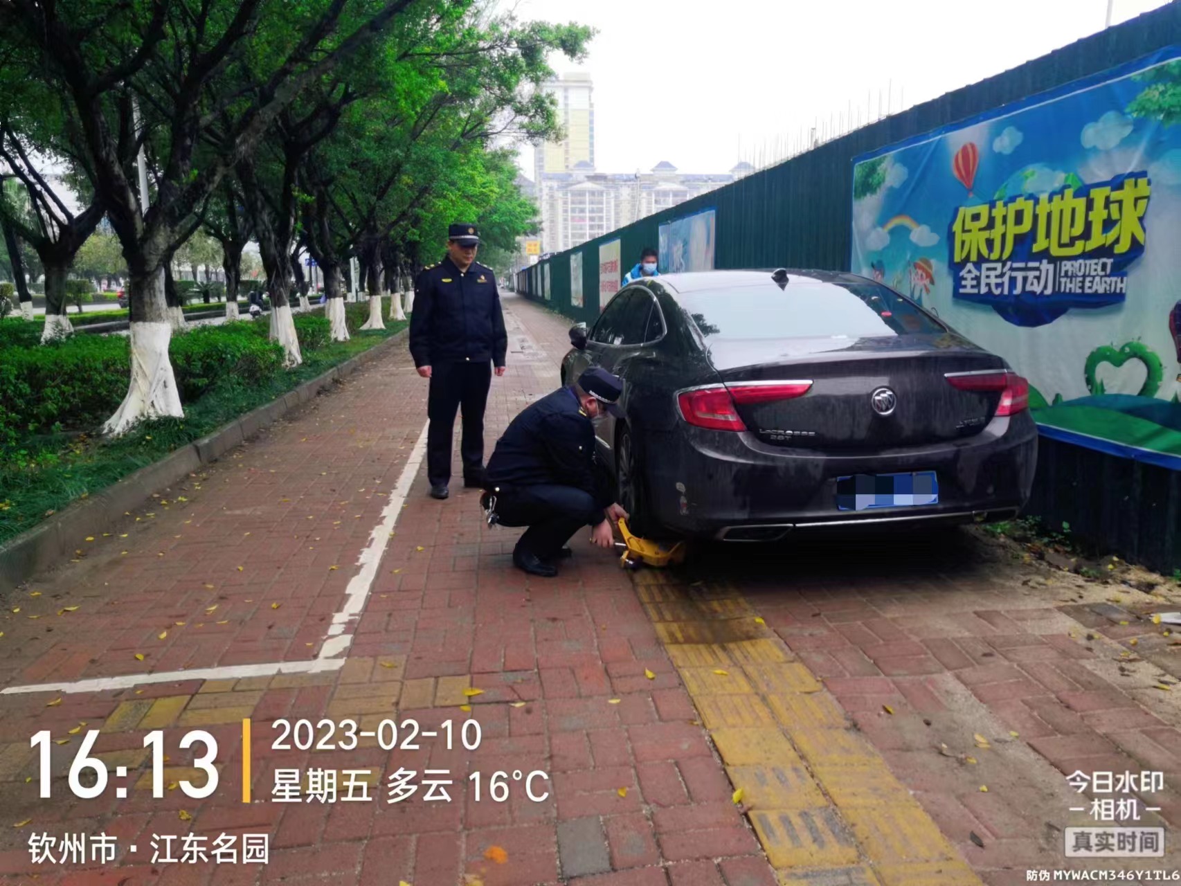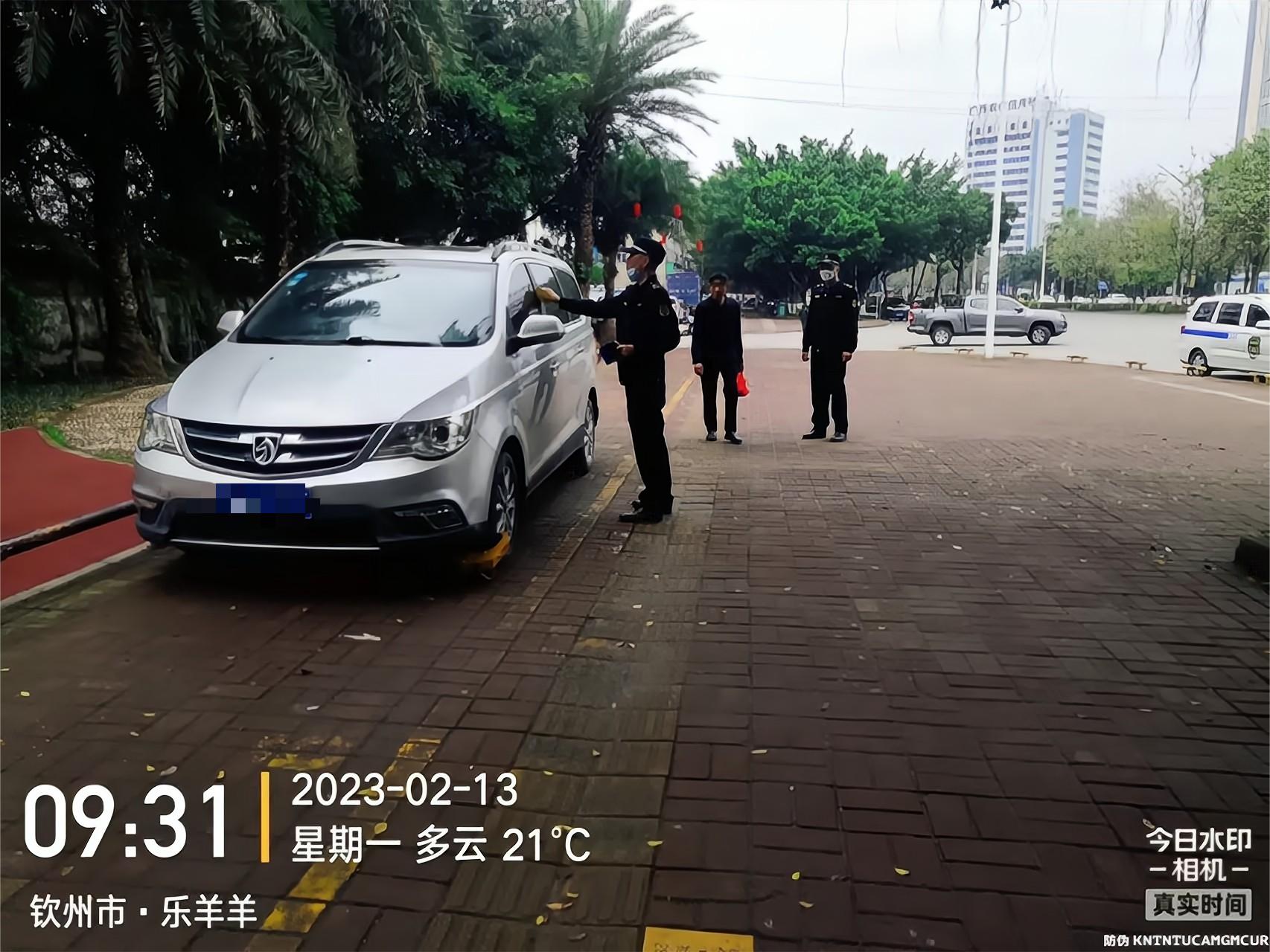 执法人员整治人行道违停车辆的工作照片