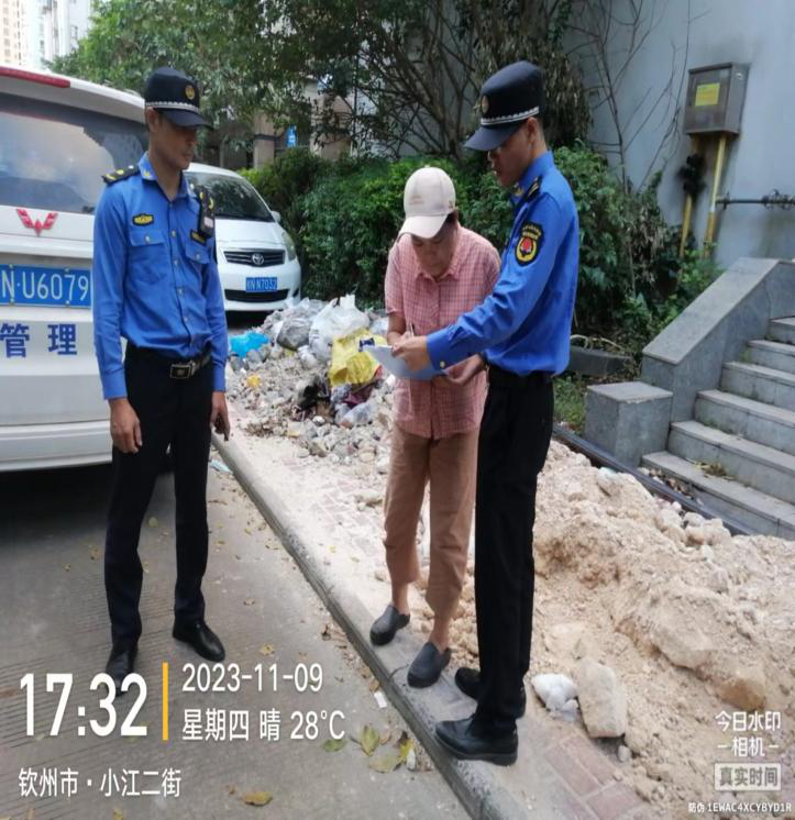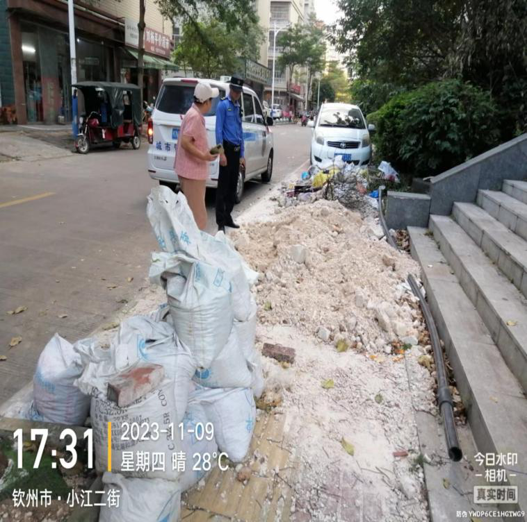 11月9日,执法人员在巡查时,发现在钦北区小江街文华名苑小区前人行道上,有人乱堆放建筑垃圾。通过调查走访了解,执法队员找到了居住在附近的当事人,随即对当事人下达了《责令改正通知书》,责令当事人立即清理建筑垃圾,并对其进行了批评教育。
