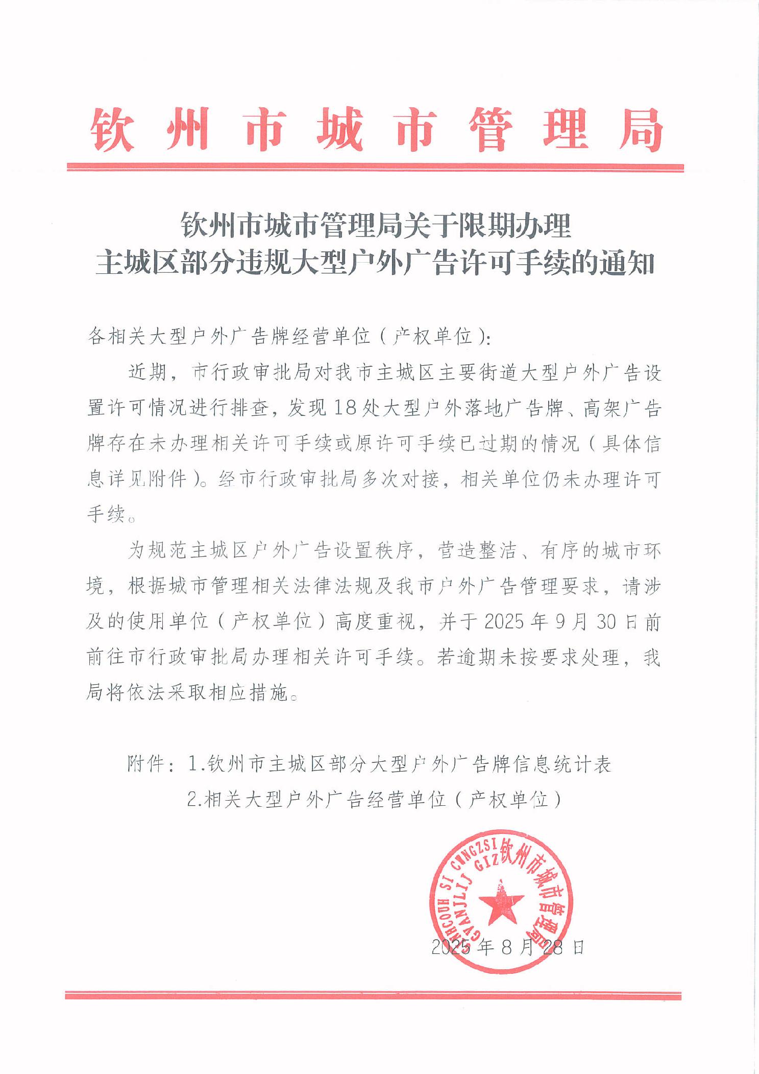 钦州市城市管理局关于限期办理主城区部分违规大型户外广告许可手续的通知